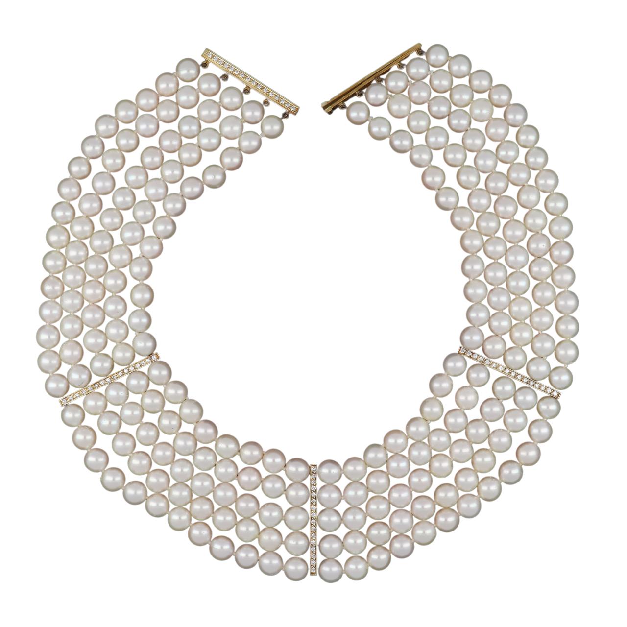 A Vintage five-row Akoya pearl choker necklace with diamond bars, set in 18K yellow gold. Circa 1980.