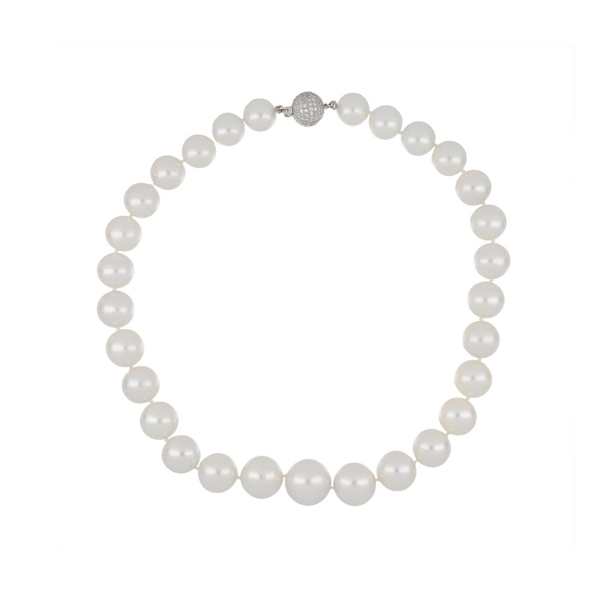 A graduated pearl strand necklace with an 18 karat white gold diamond clasp. Vintage & Estate Collection 29 south sea pearls=12.20-16.9mm 145 round brilliant cut diamonds= 2.15 total carat weight, G-H color, VS clarity 17"
