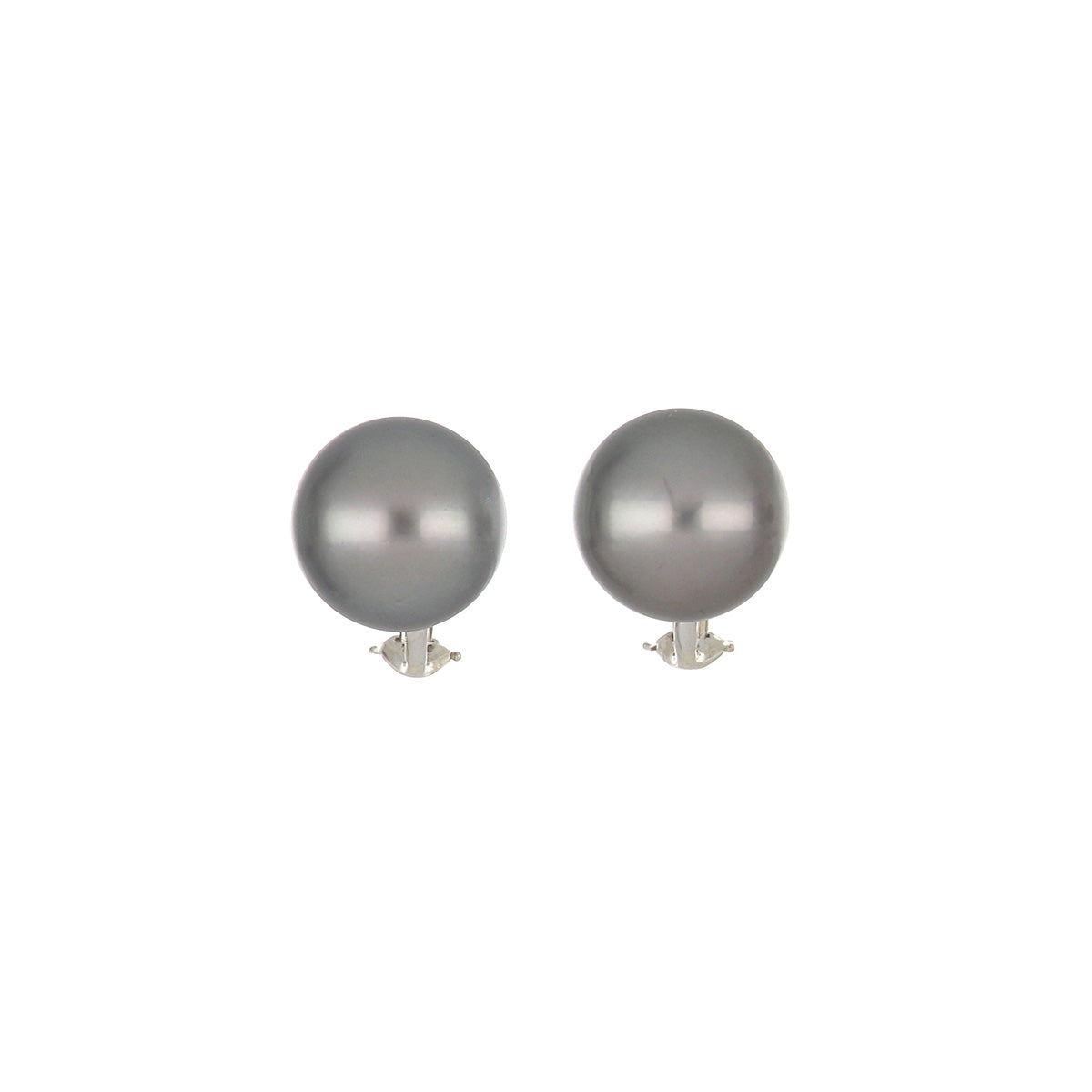 A pair of estate modern grey tahitian pearl button earrings set in 14k white gold. Circa 2000.