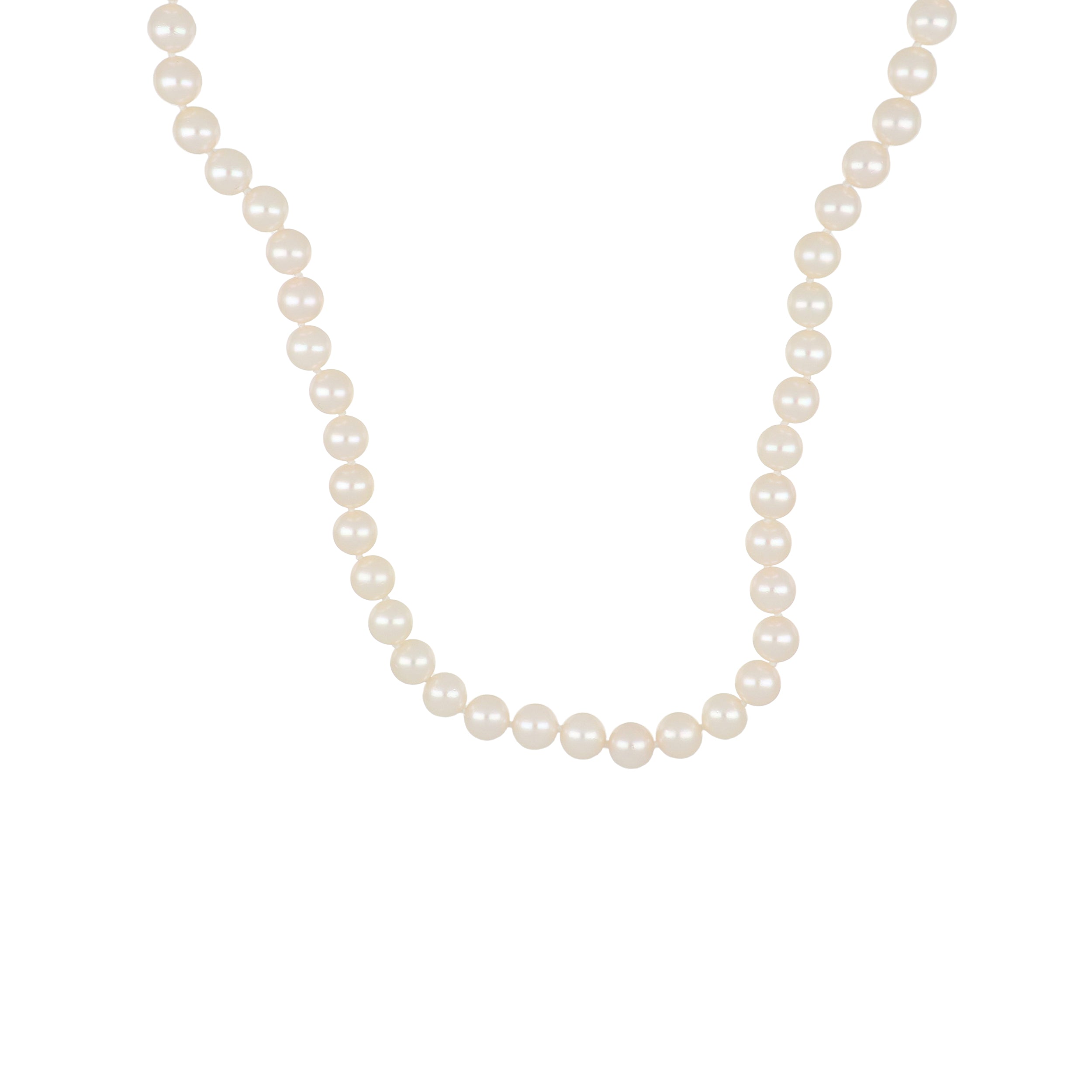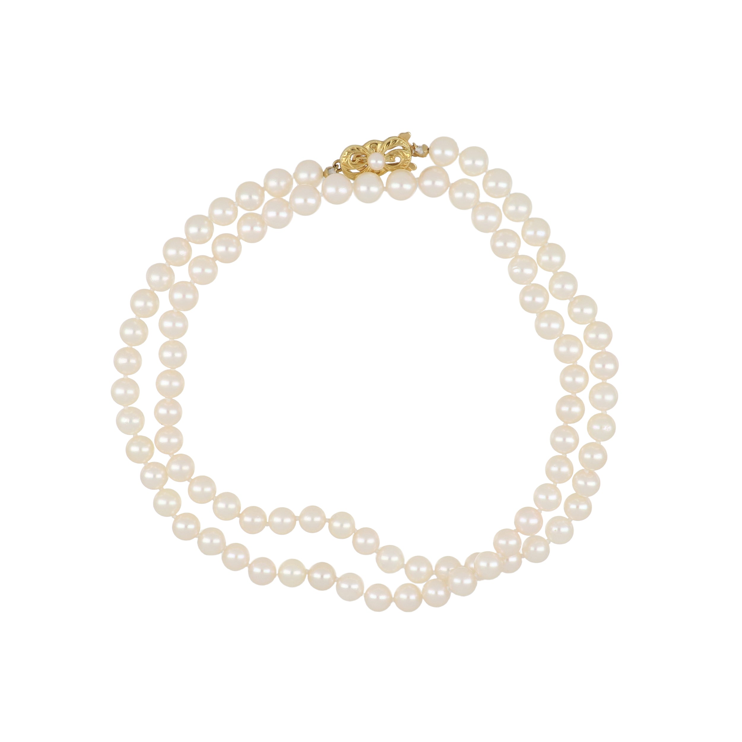 A vintage Mikimoto cultured akoya pearl necklace with an 18K yellow gold clasp. Circa 1990.