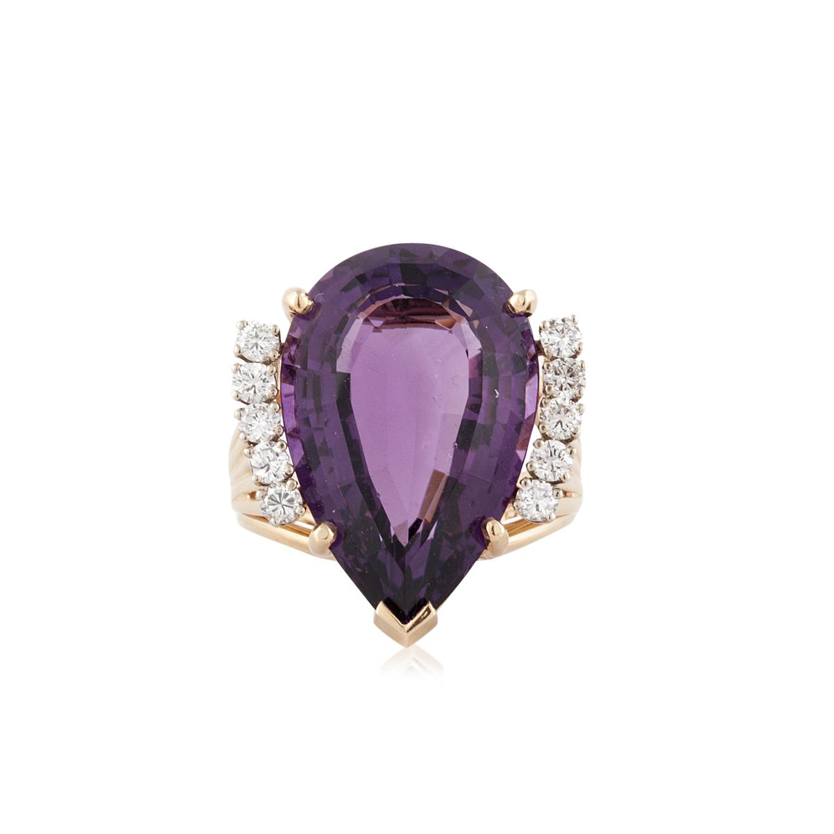 A vintage pear shape amethyst cocktail ring with round brilliant-cut diamond accents, set in 14K yellow gold. Circa 1980.