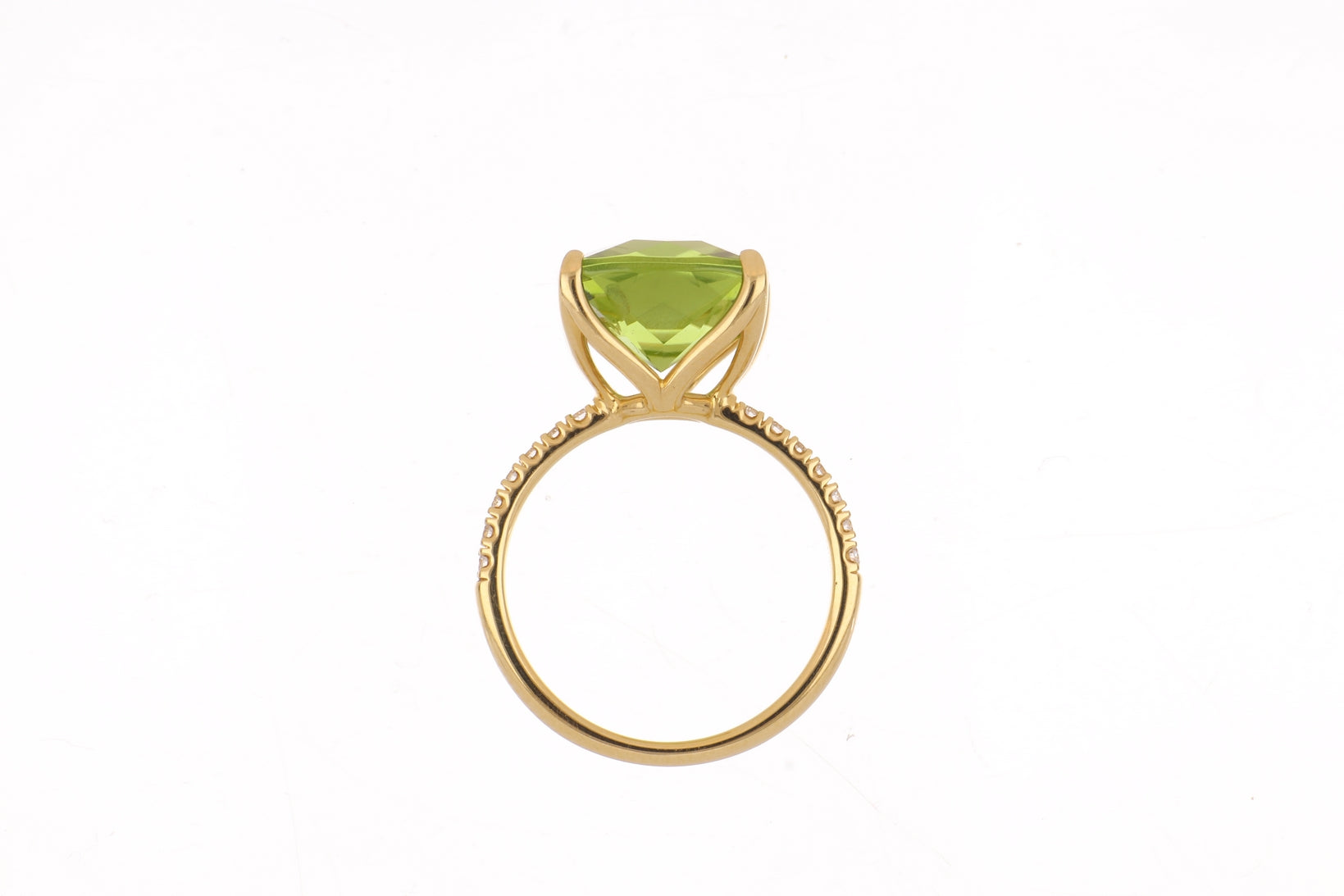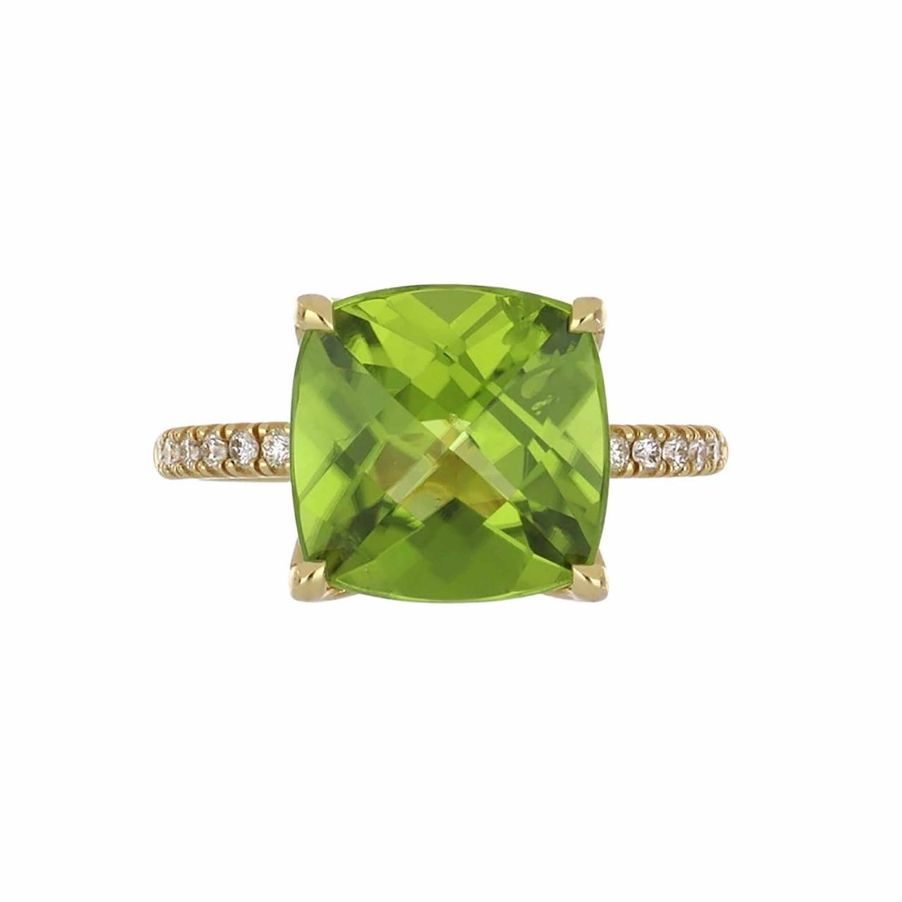 A Lisa Nik 'Rocks' ring featuring a cushion-shaped peridot with round diamonds in 18k yellow gold.