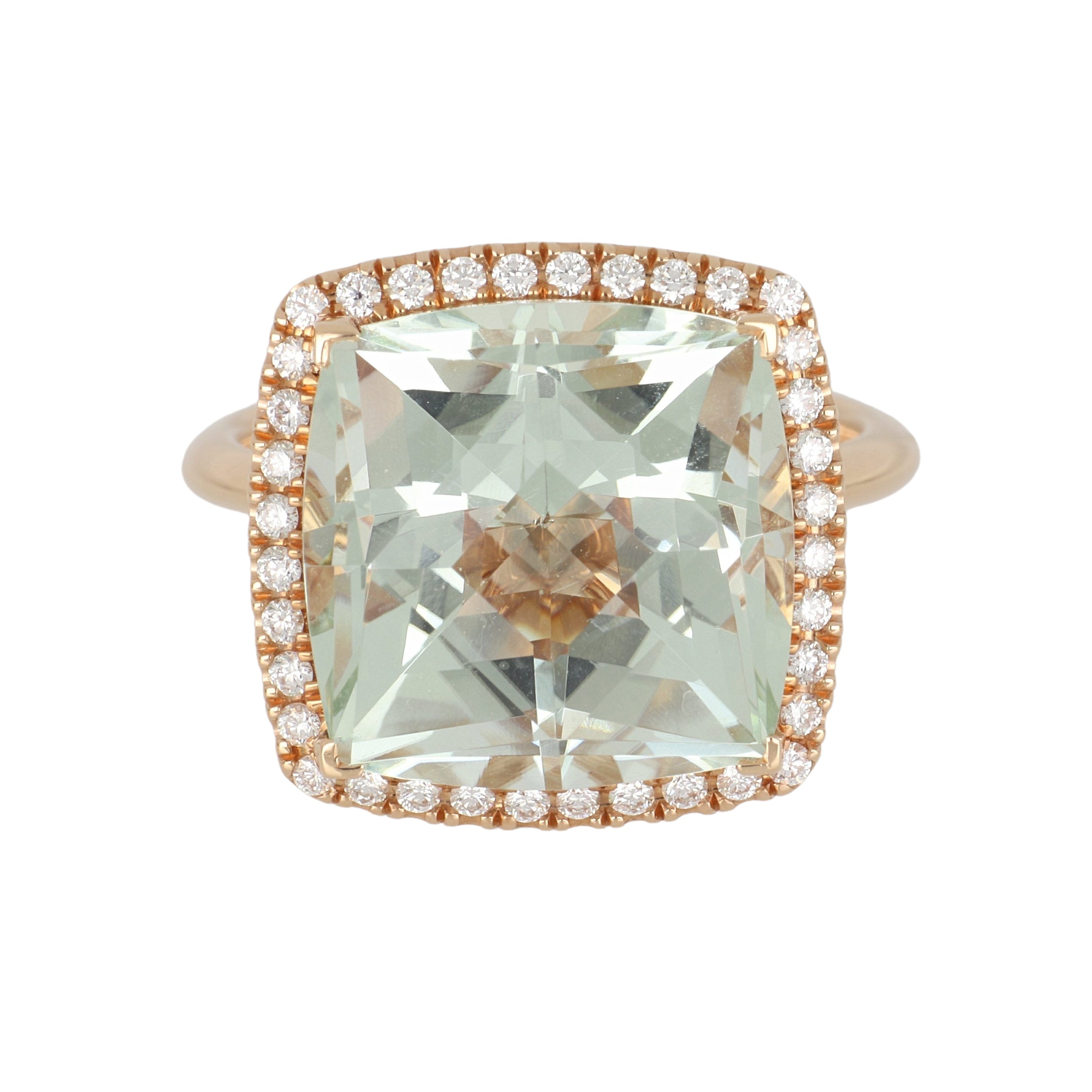A Lisa Nik 'Rocks' collection ring featuring a cushion-shaped green quartz framed by round diamonds in 18K rose gold.