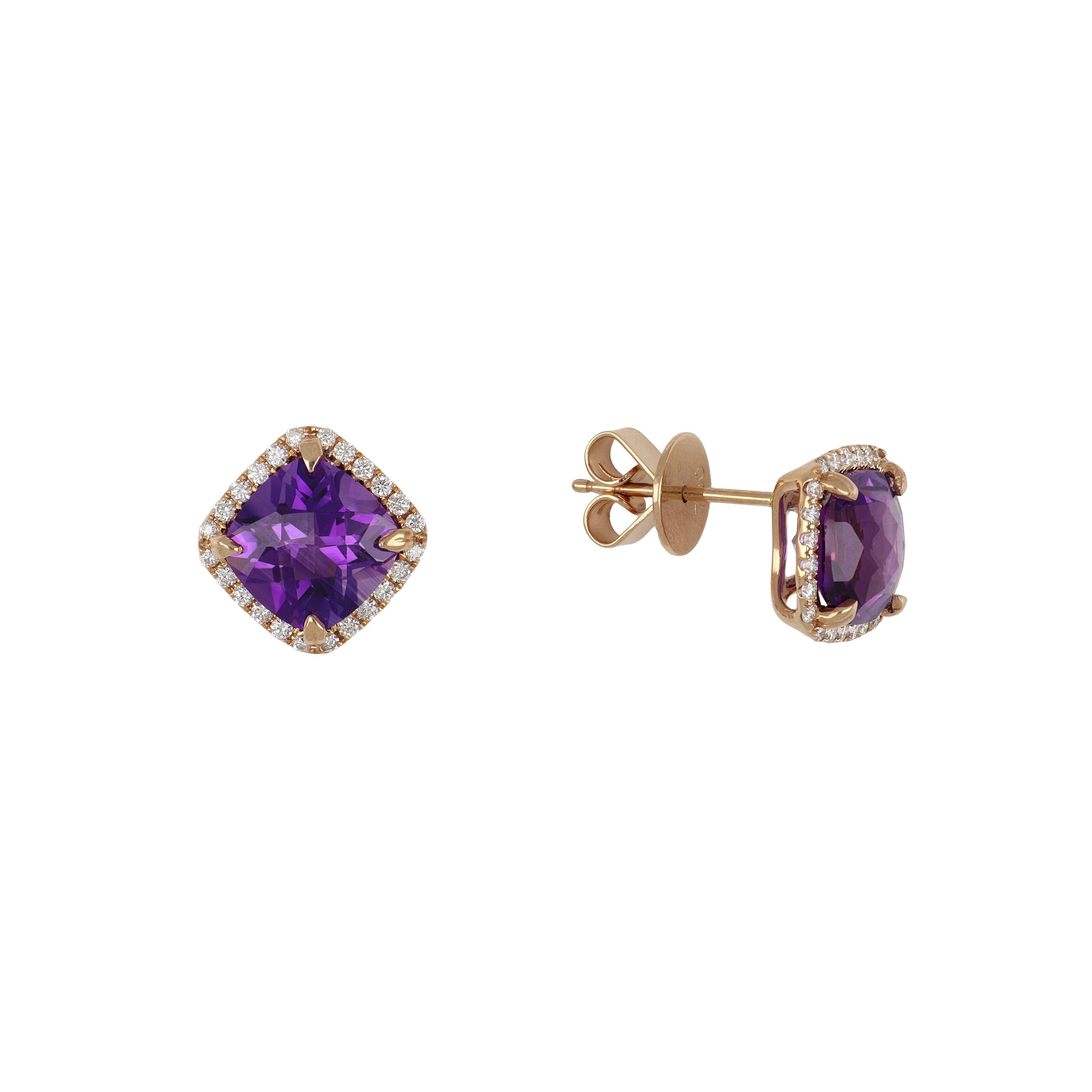A pair of Lisa Nik 'Rocks' collection stud earrings featuring cushion-cut amethysts framed by round diamonds, set in 18K rose gold,