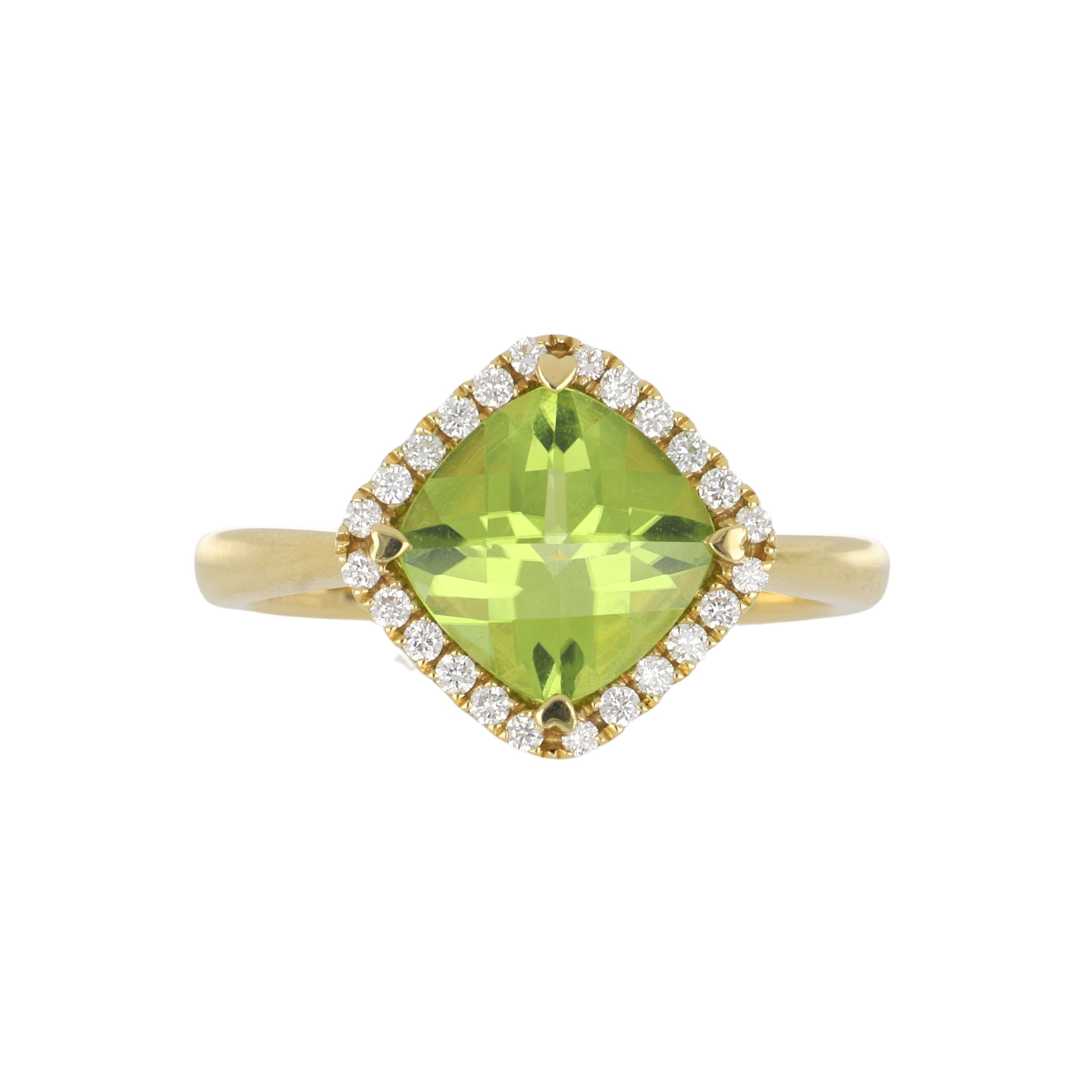 A Lisa Nik 'Rocks' collection ring featuring a cushion-shaped peridot with a round brilliant-cut diamond halo, set in 18K yellow gold.