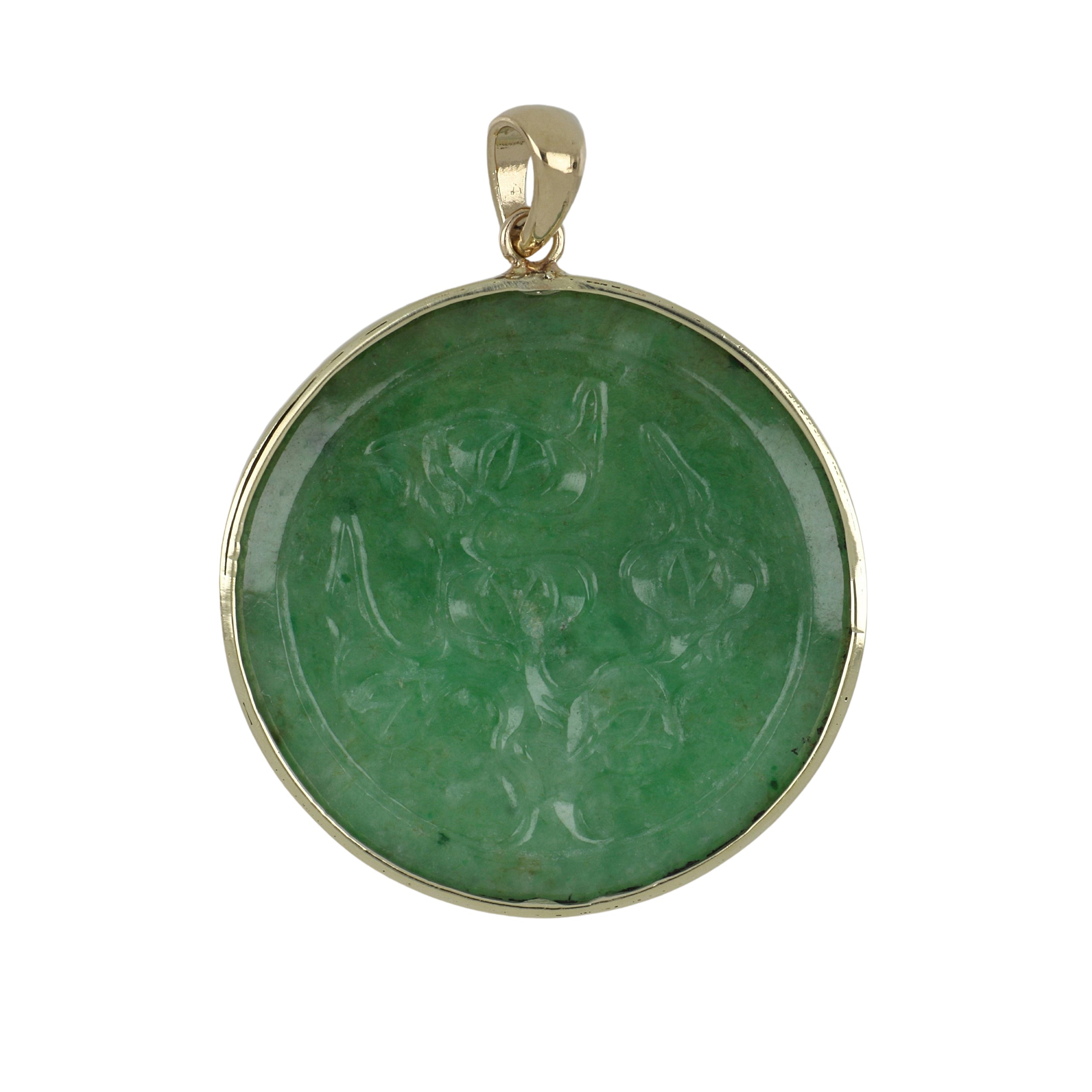 An estate carved jadeite disc pendant, set in 14K yellow gold.