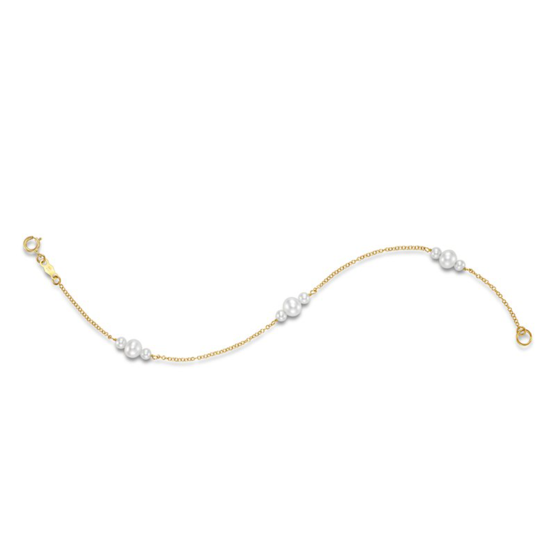 A Mastoloni chain bracelet with triple pearl stations, set in 14K yellow gold.