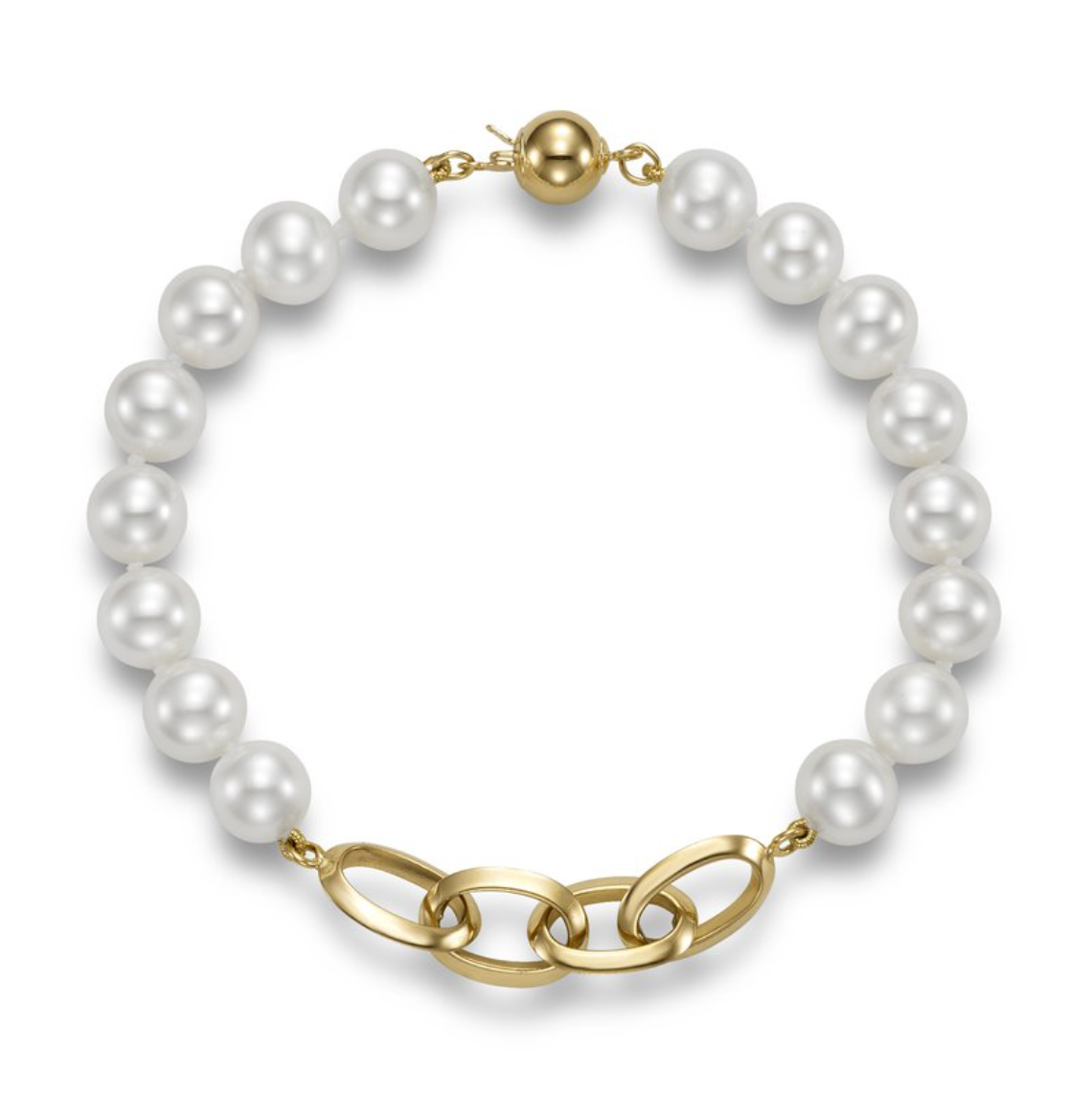 A Mastoloni pearl bracelet with a link station in 14K yellow gold.