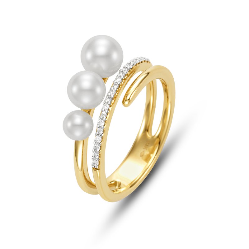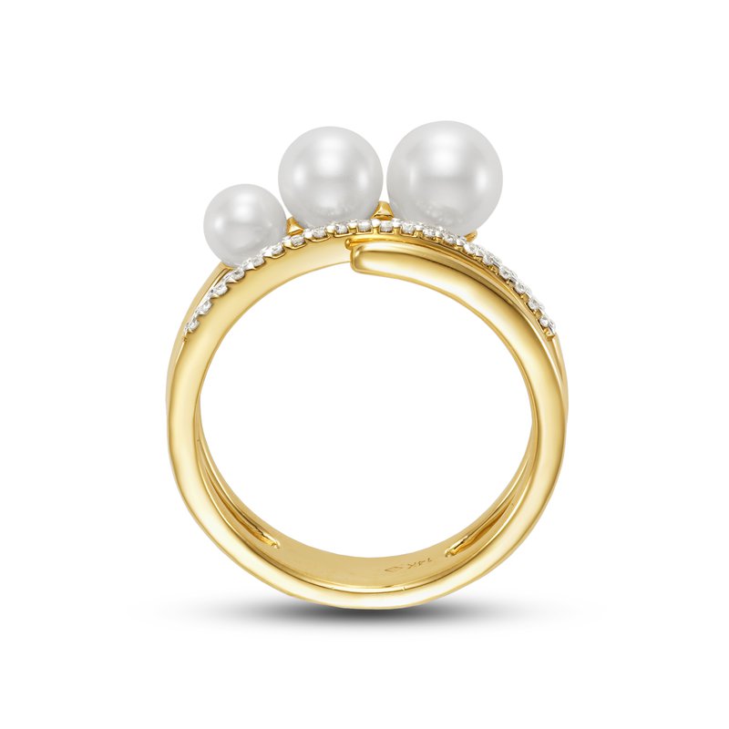 A Mastoloni three pearl wrap ring with diamonds, set in 14K yellow gold.