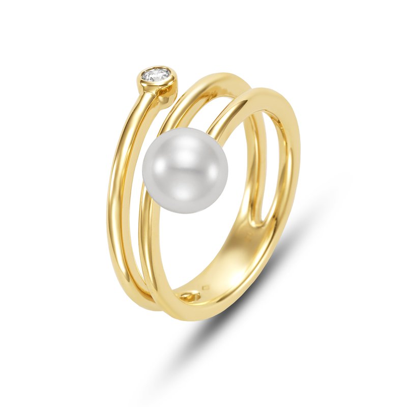 A Mastoloni 14 karat yellow gold 3 row roll ring with a single pearl and diamond.
