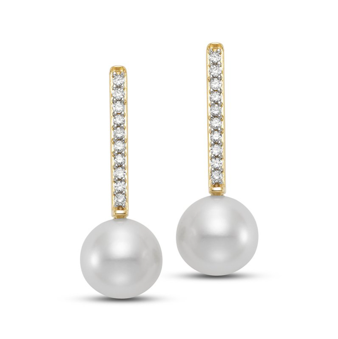 A pair of Mastoloni diamond bar earrings with pearl ends, set in 14K yellow gold.Official Retailer2 Round pearls: 7-7.5mmDiamonds: 0.10 total carat weightLength: 0.75 in.