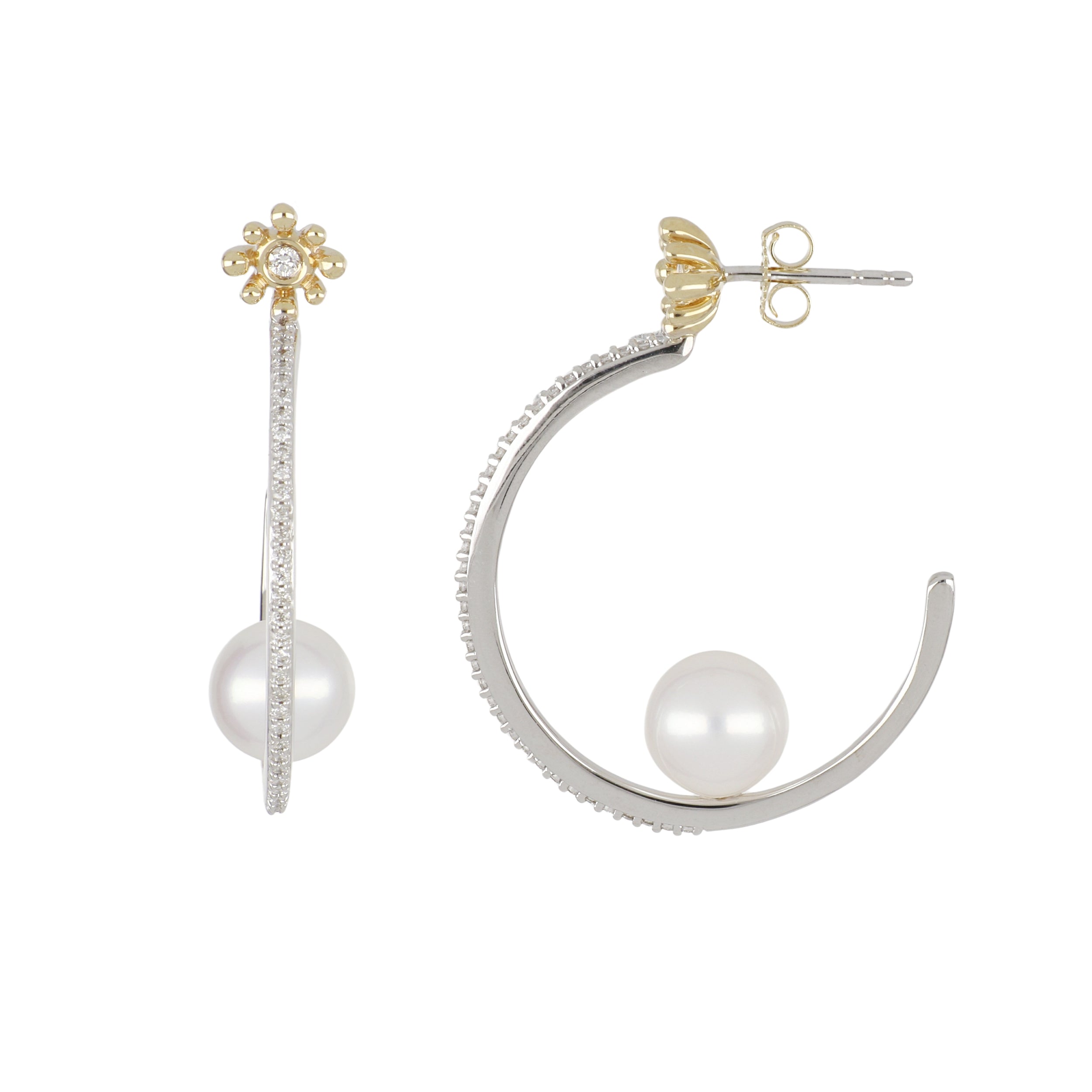 A pair of Mastoloni diamond hoop earrings with flower tops & pearls, set in 14K white & yellow gold.