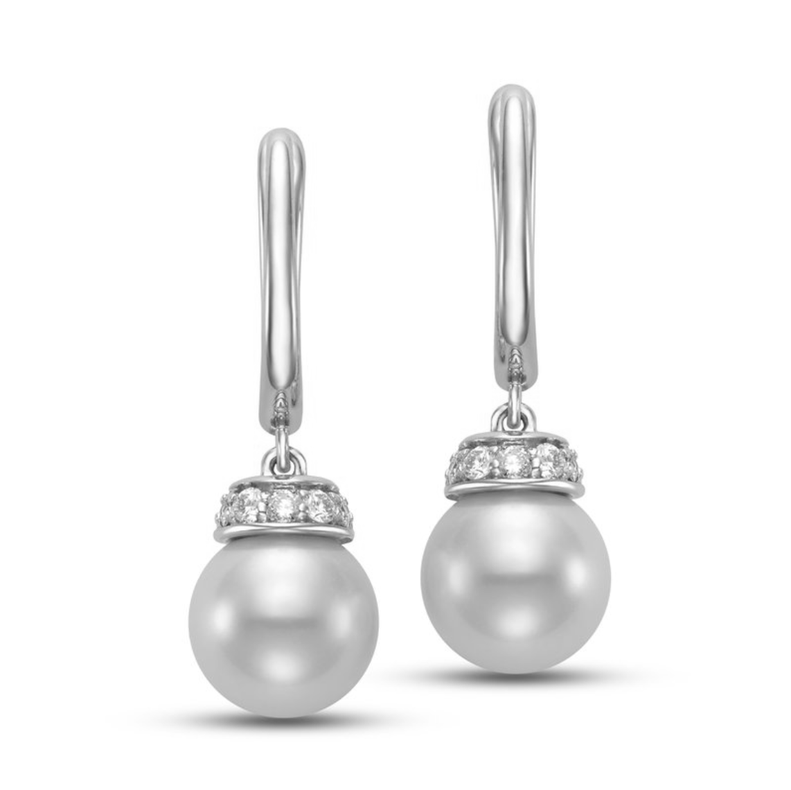 A pair of Mastoloni 14K white gold pearl drop earrings with diamonds. Official Retailer 2 Freshwater pearls: 9.5-10mm Diamonds: 0.25 total carat weight