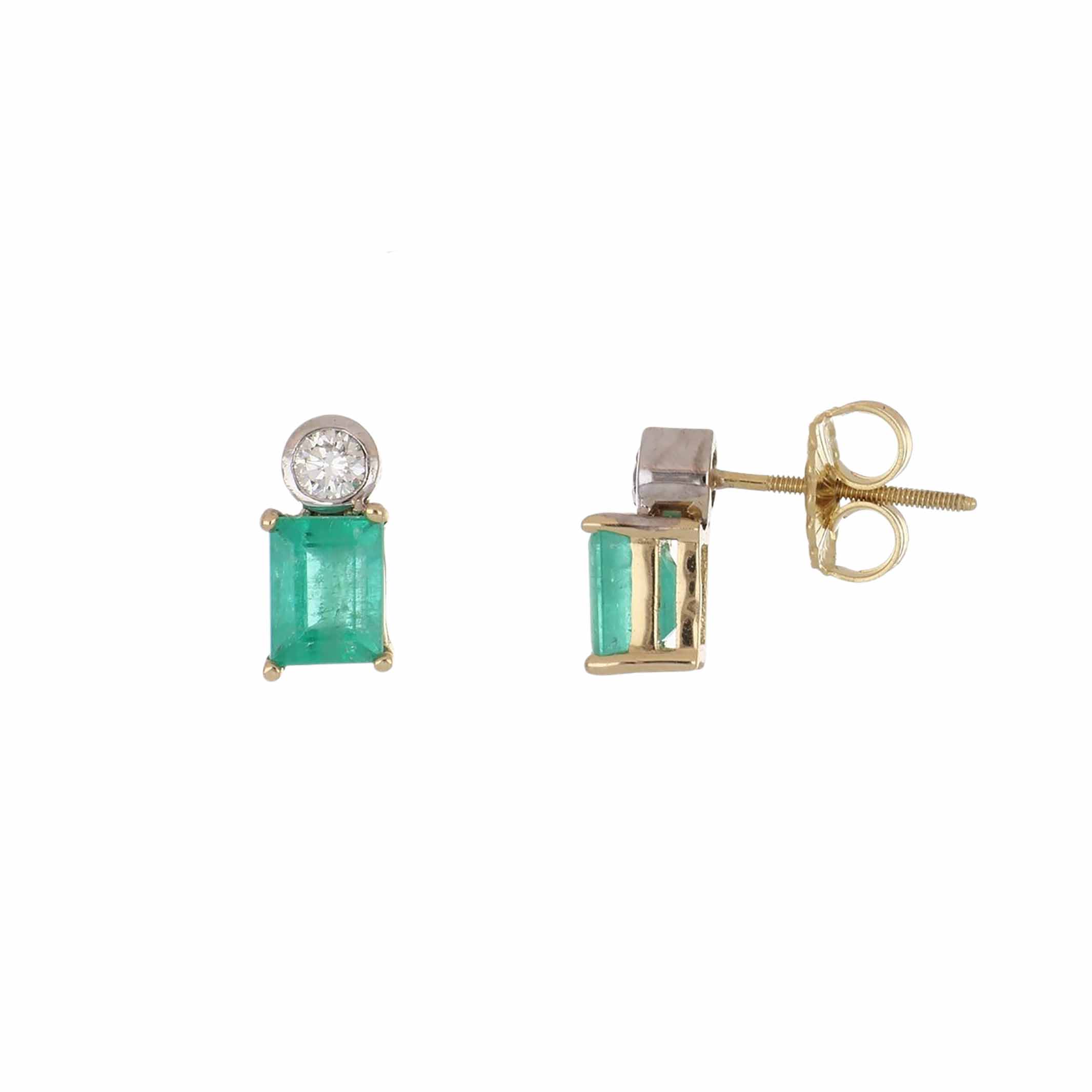 A pair of emerald-cut emerald and round brilliant-cut diamond stud earrings, set in 18K yellow and white gold.
