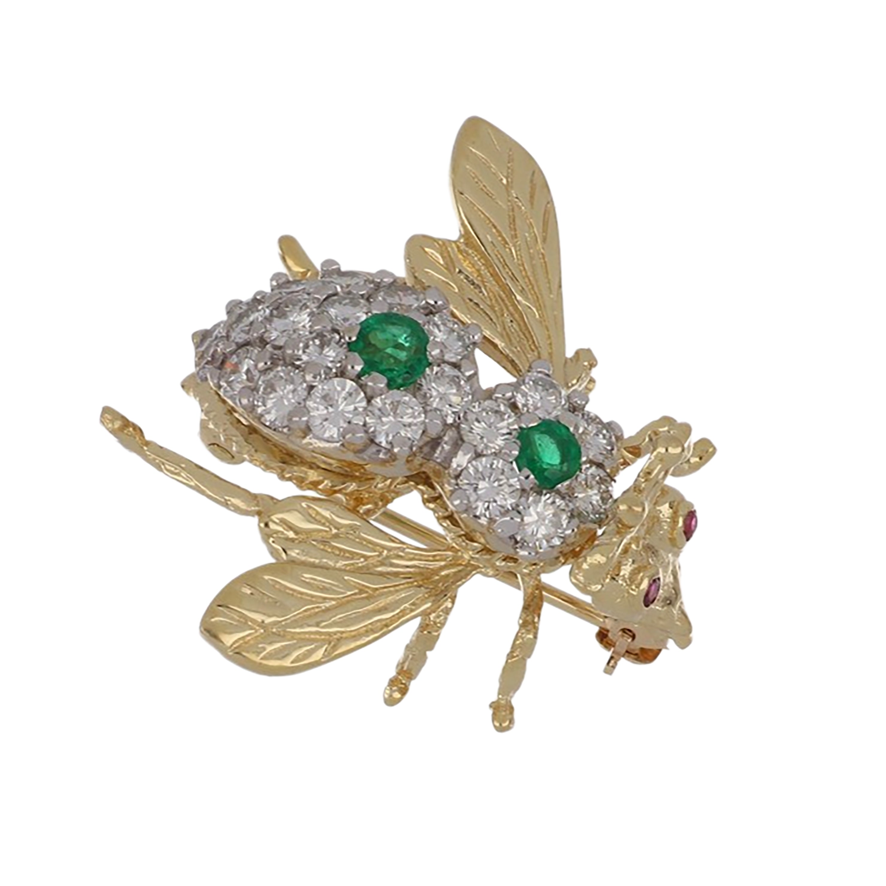 A mid-century bee pin with round diamonds, emeralds and ruby eyes in 14k white and yellow gold. Signed: C.F, Circa 1950.