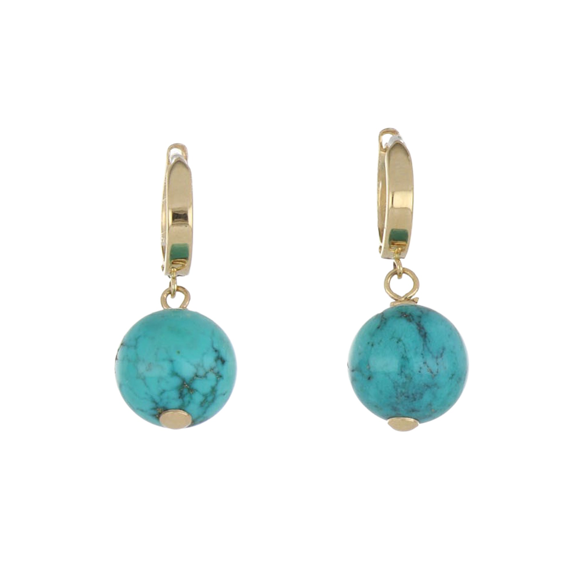 A mid-century 14K yellow gold turquoise necklace with gold beads and drop earrings set.