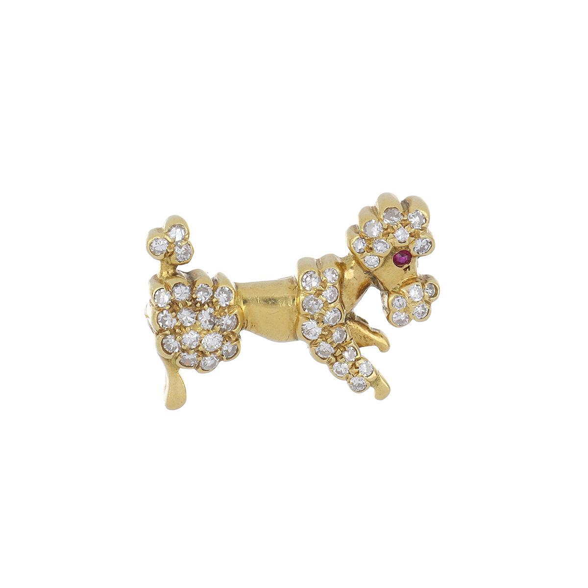 A Mid Century diamond poodle pin with a ruby eye, set in 18K yellow gold. Circa 1950..