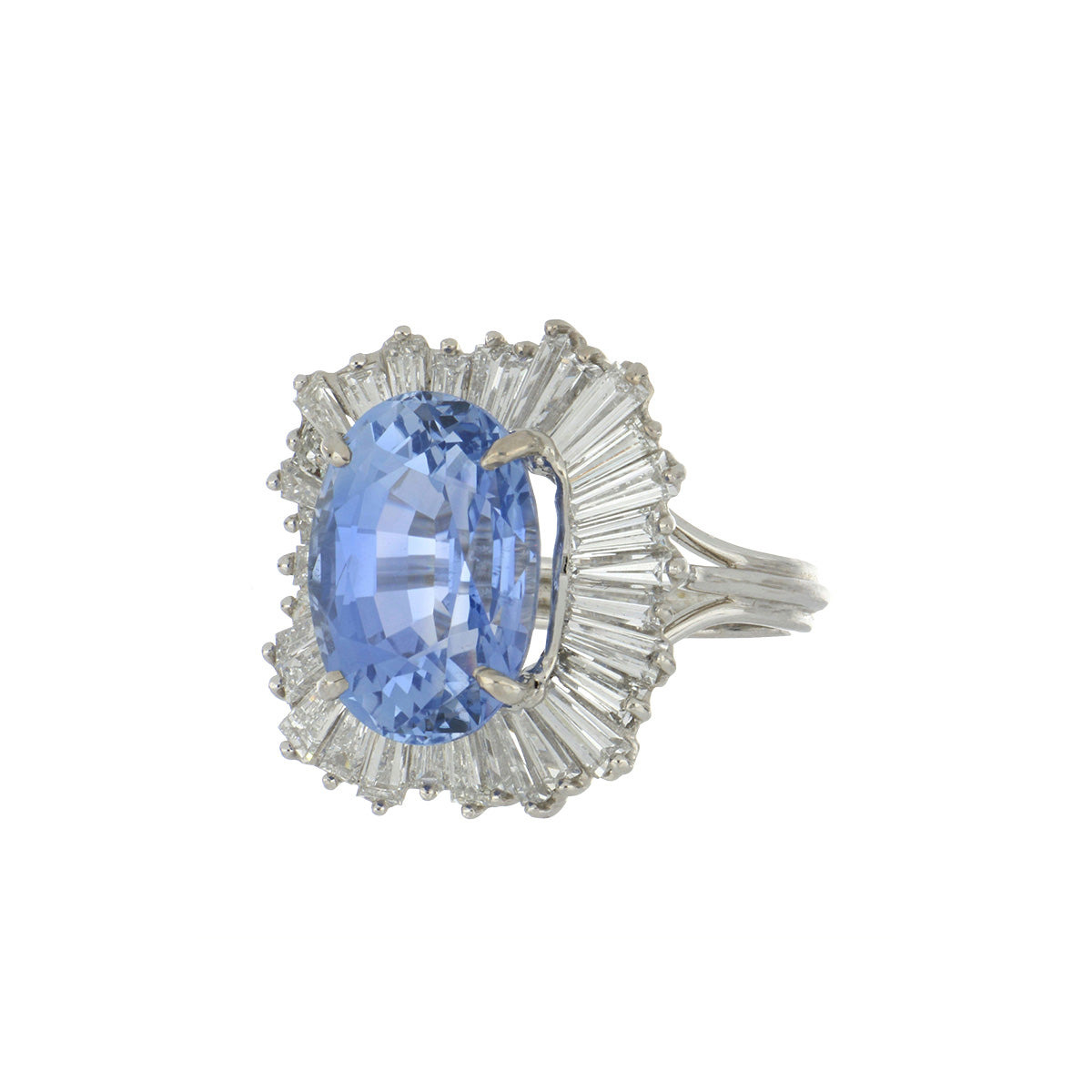 A Mid-Century platinum ceylon sapphire undulating cushion-shape ballerina ring with diamonds. Circa 1960.