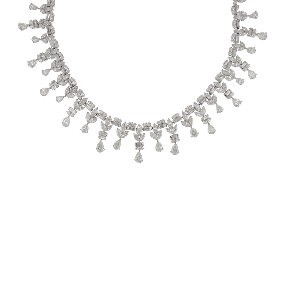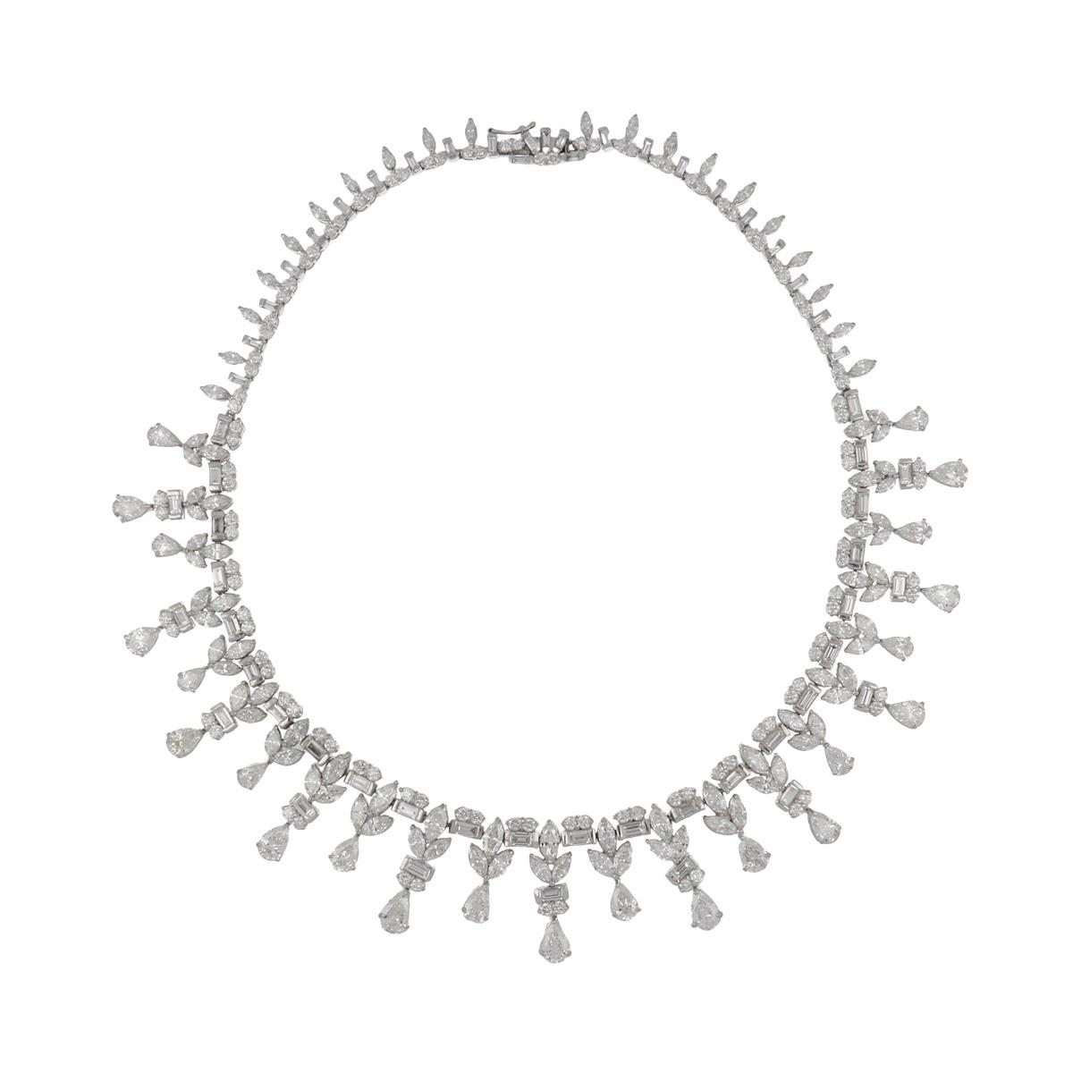 An important Mid-Century garland-style fringe necklace with graduated baguette and round brilliant-cut diamond links supporting numerous fancy-shape diamond drops, set in platinum. Circa 1960.