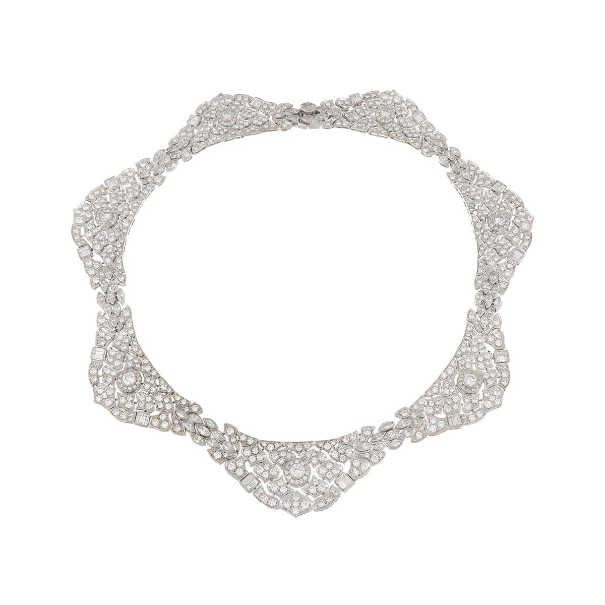 A Mid-Century openwork scalloped round brilliant-cut, baguette-cut, and marquise brilliant-cut diamond necklace with seven repeated flexible sections, in 18K white gold. Circa 1950.