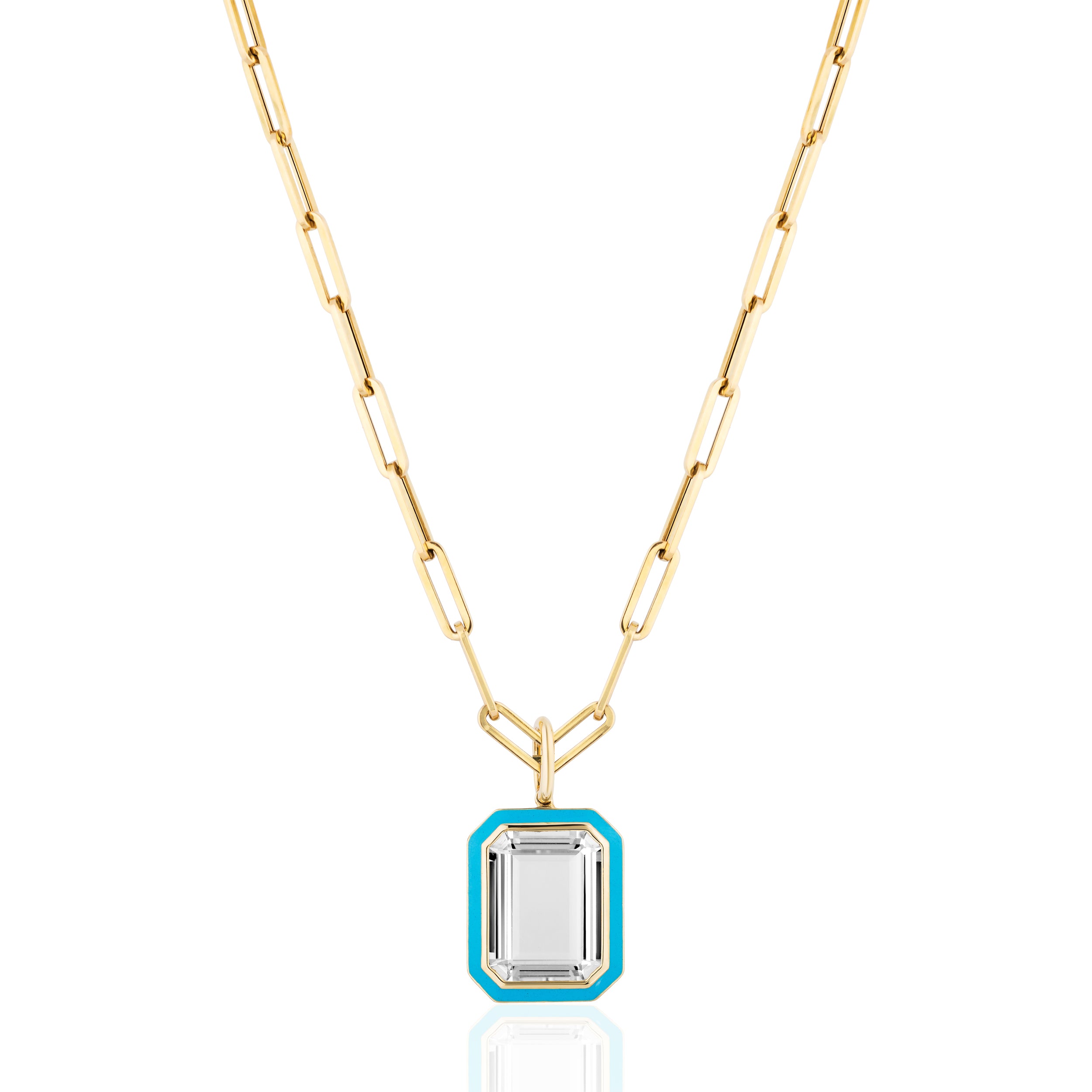 A Goshwara 'Queen' Collection pendant necklace featuring an emerald-cut rock crystal framed by a turquoise enamel border on a link chain in 18K yellow gold.