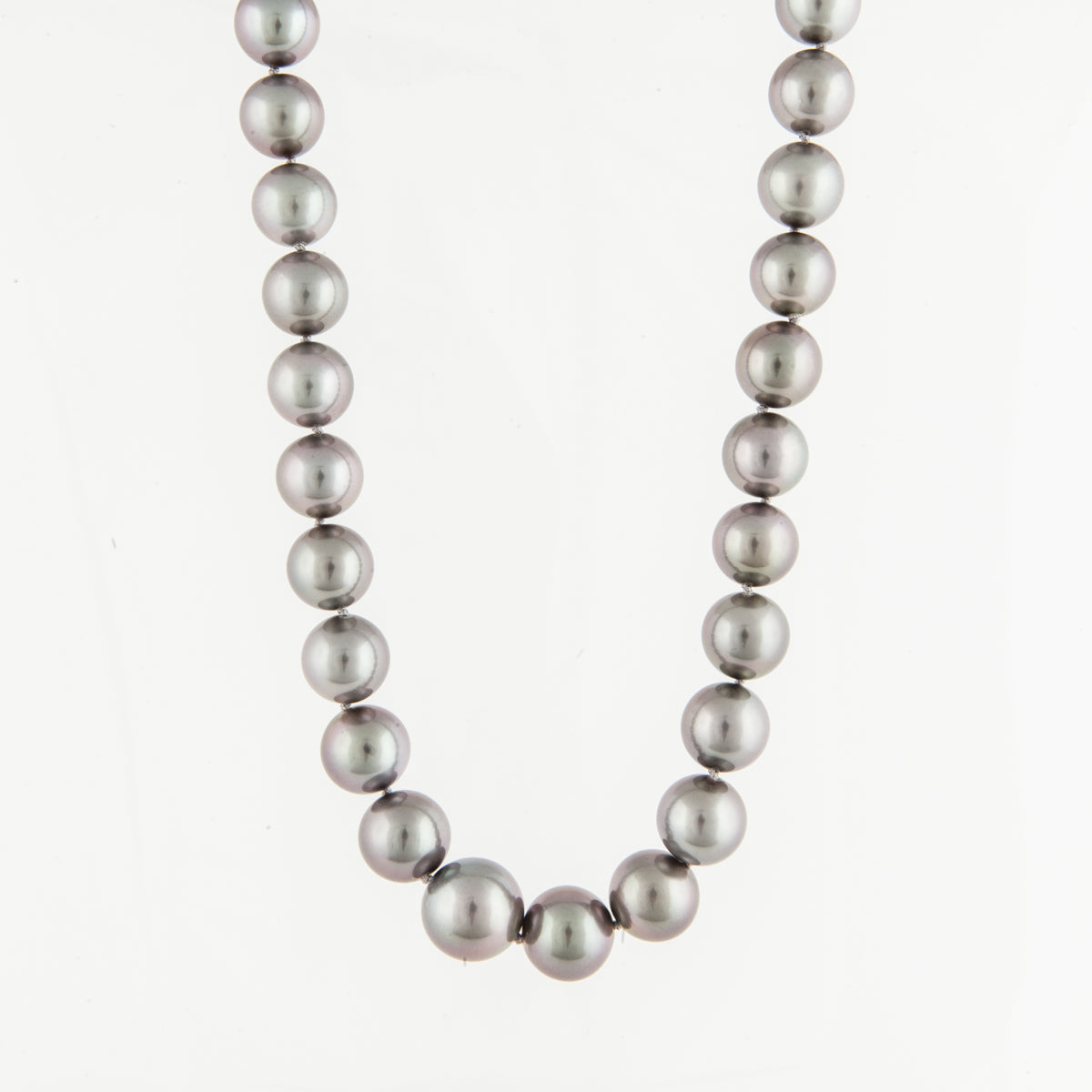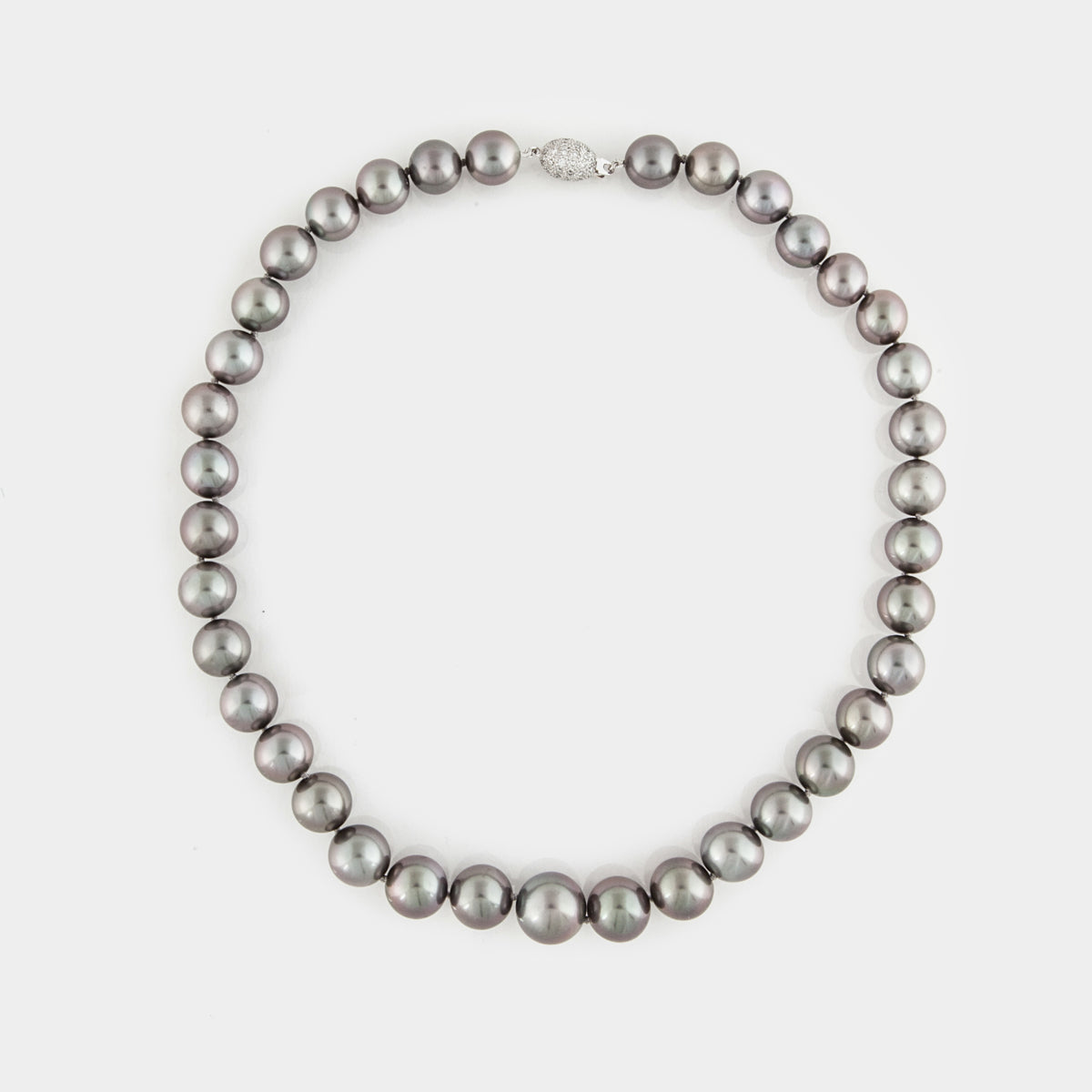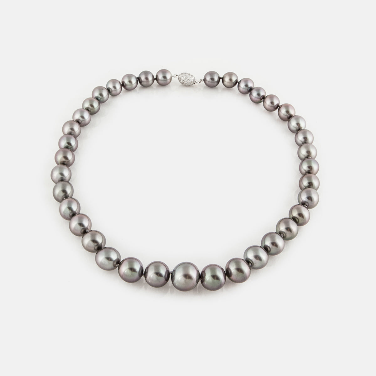 A Tahitian pearl necklace with an 18K white gold diamond clasp.