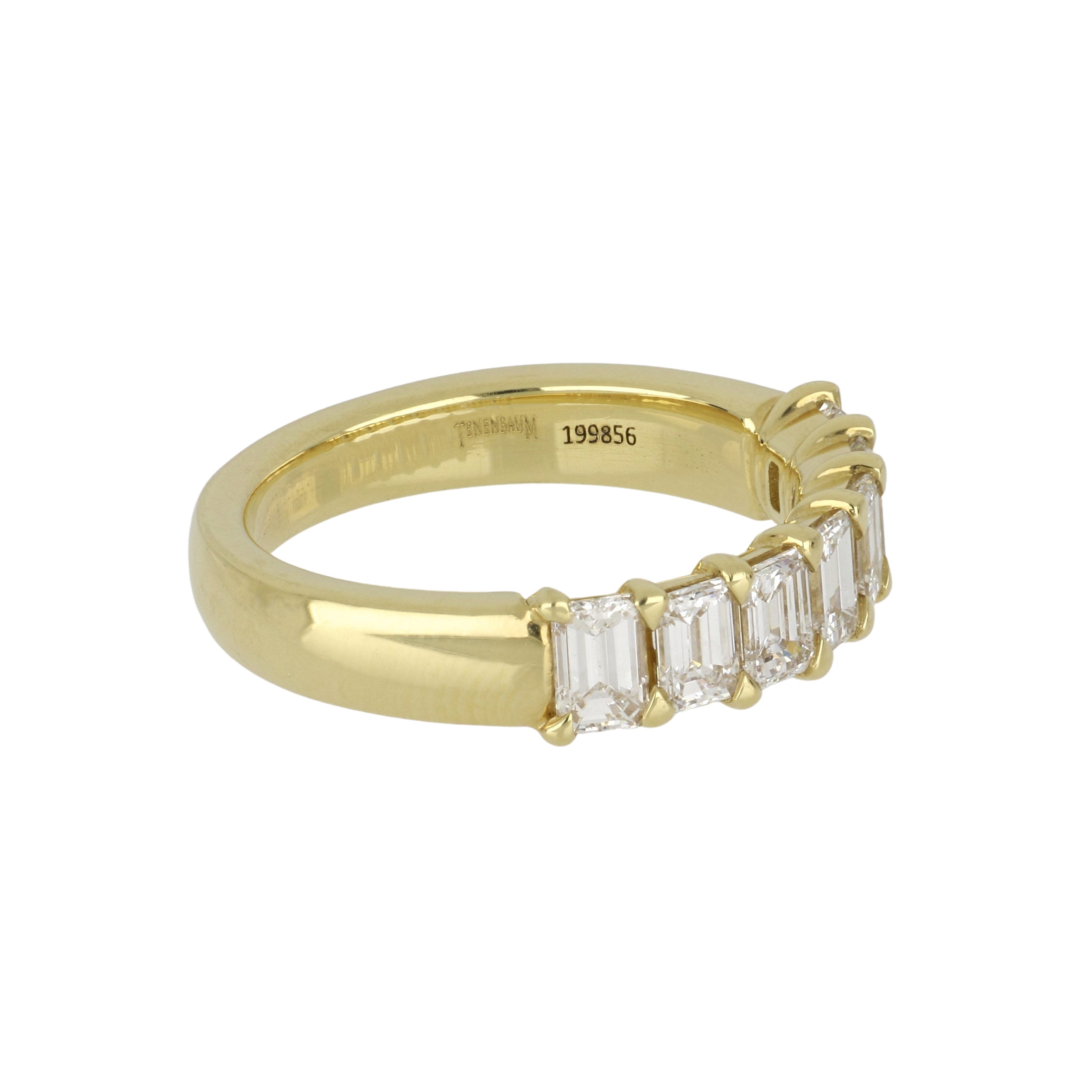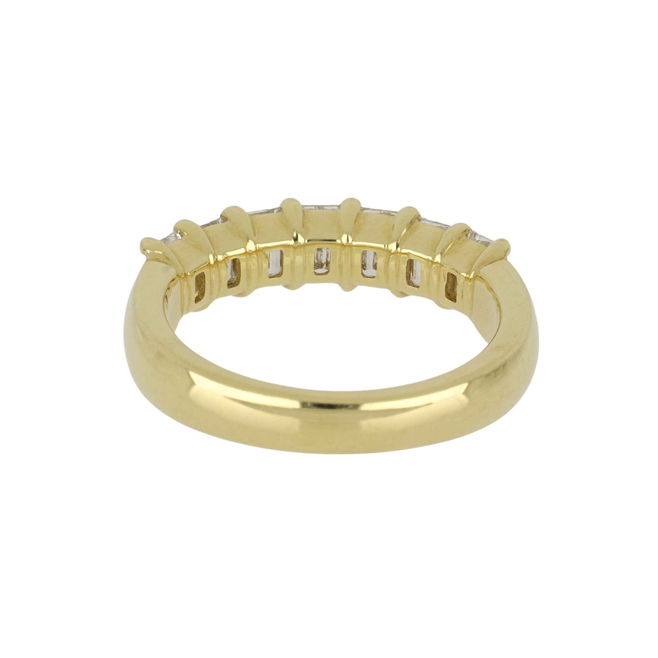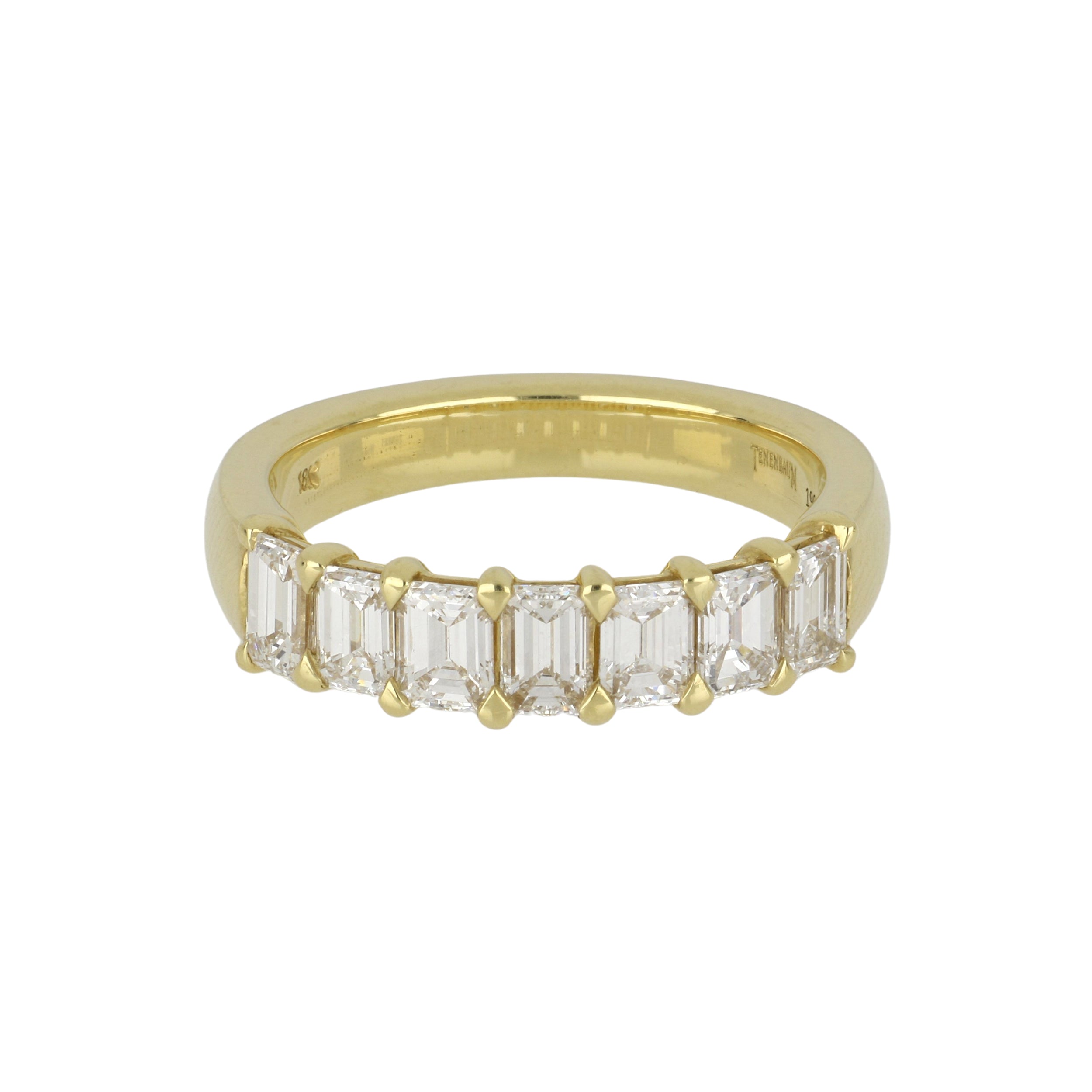 A seven stone emerald-cut diamond buttercup band, set in 18K yellow gold.