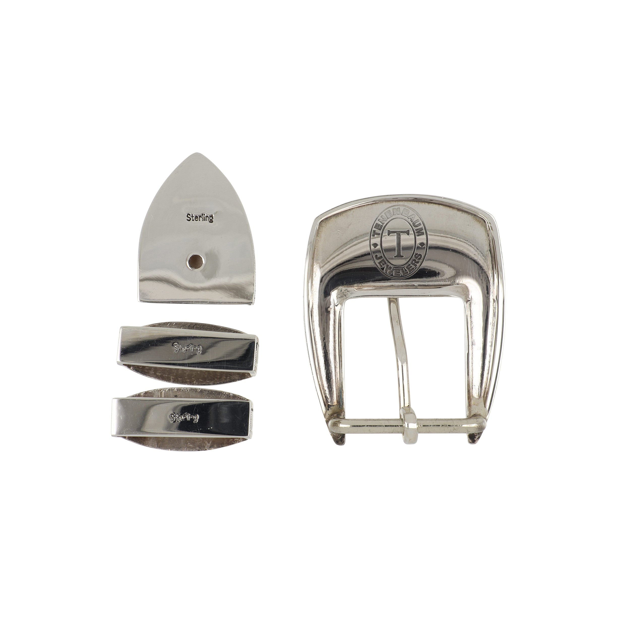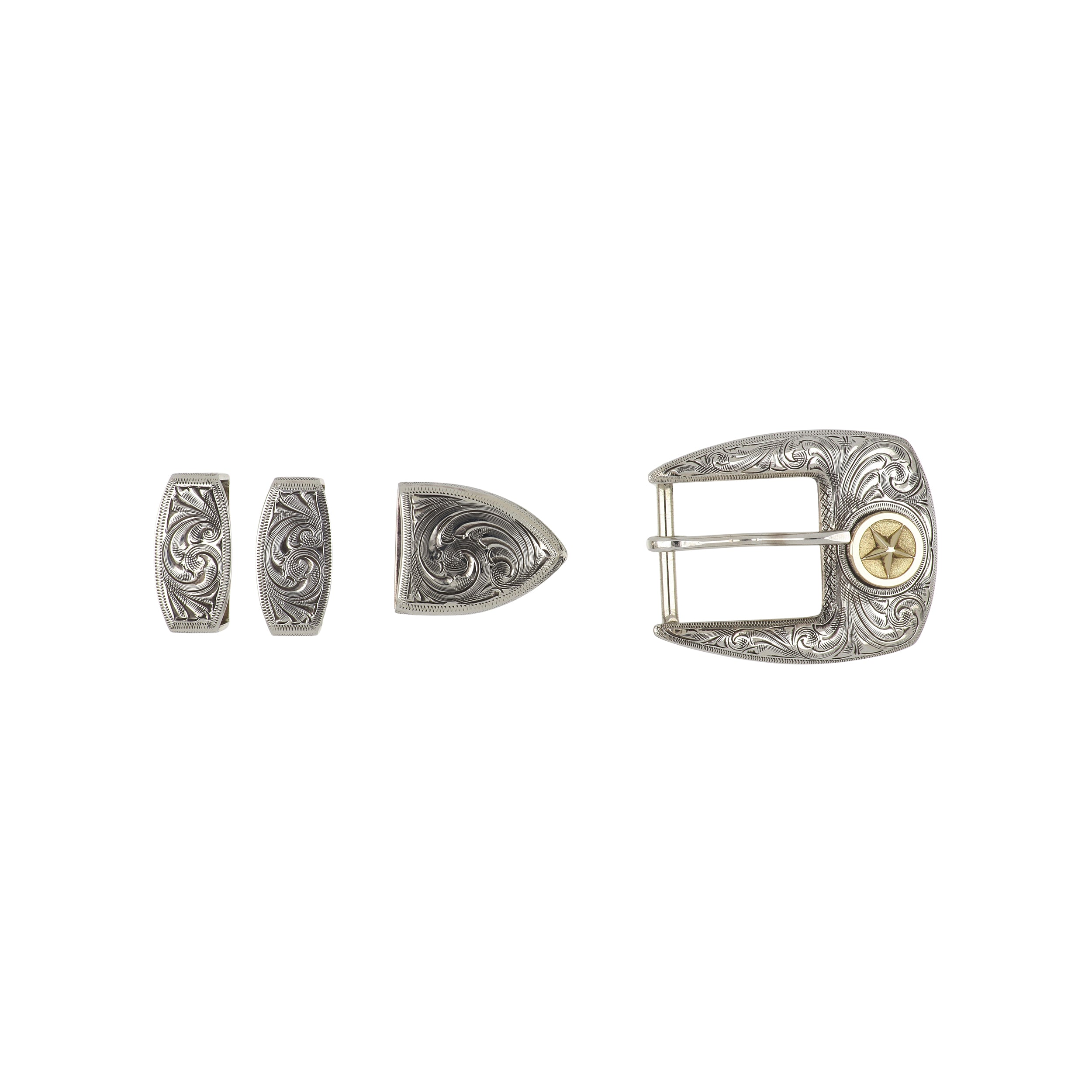 A sterling silver 4 piece engraved belt buckle set with a 18K yellow gold star. Handmade in Texas.