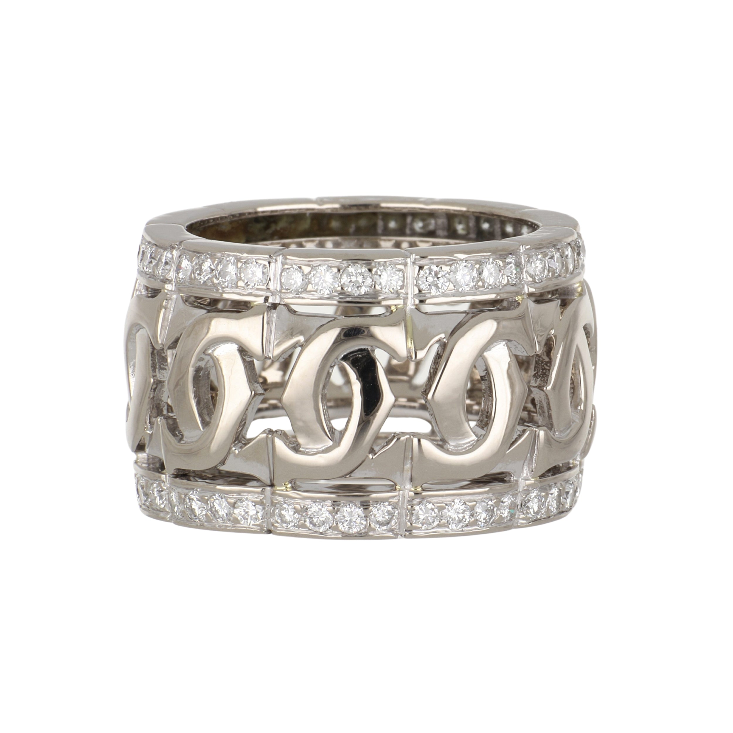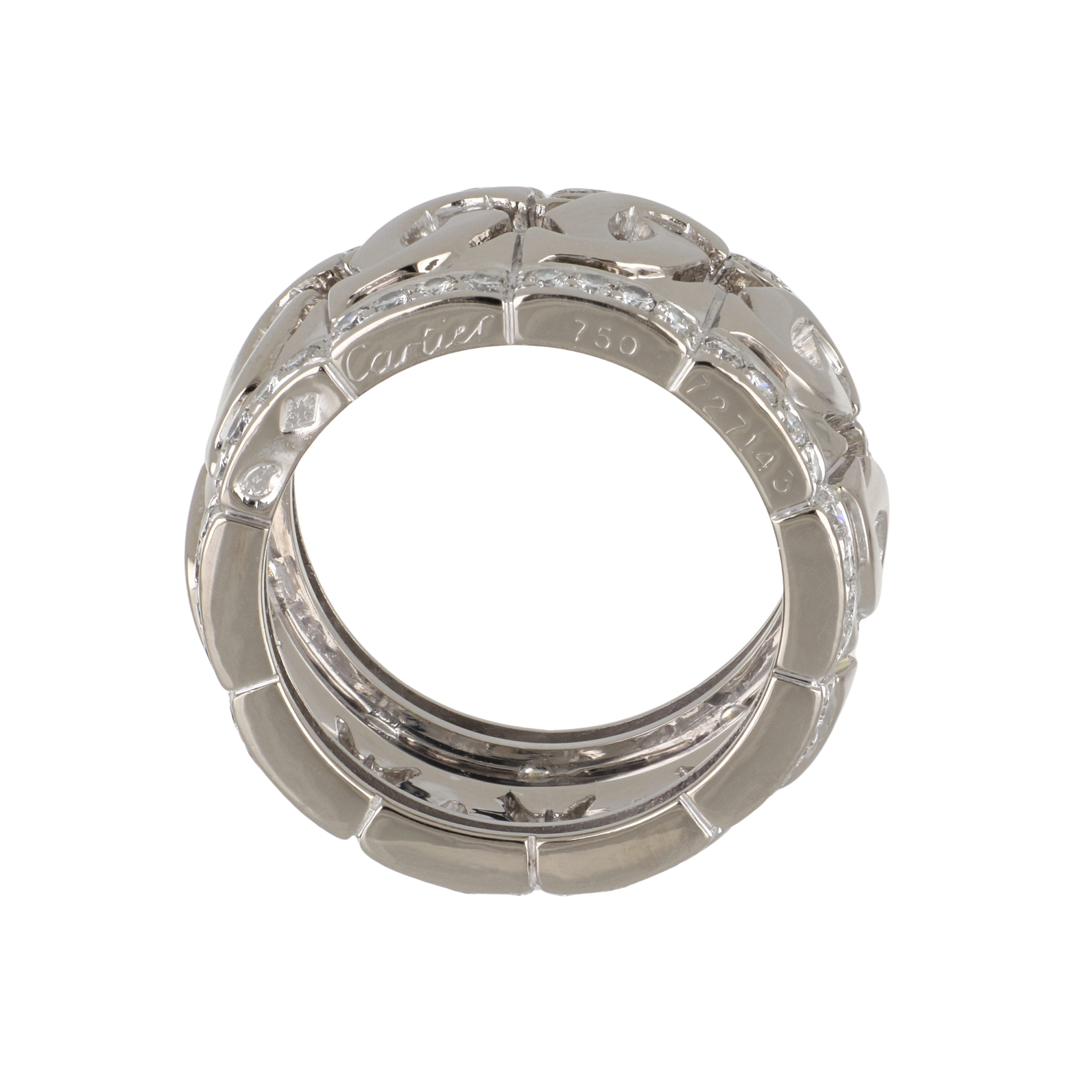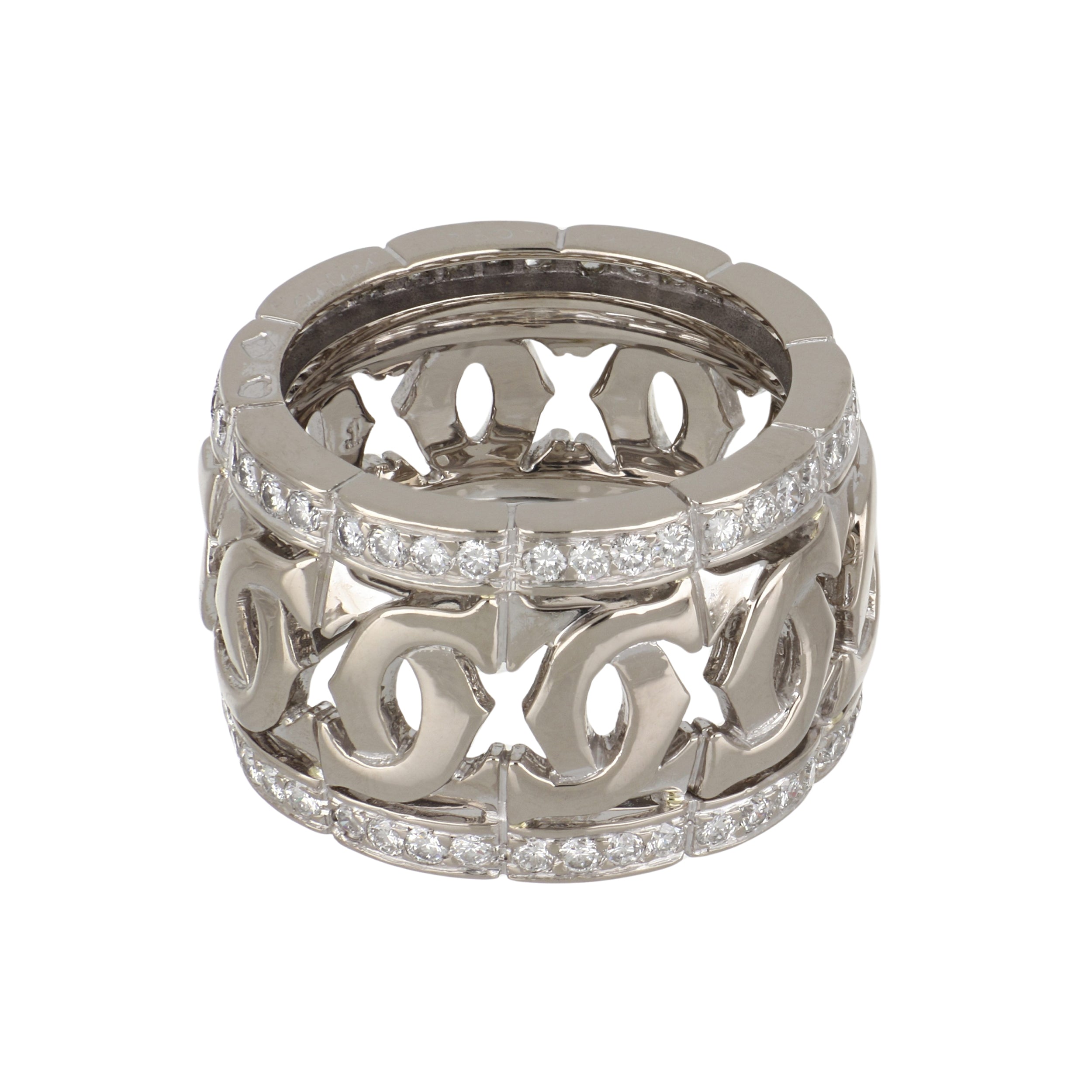 An estate Cartier Entrelaces band with round brilliant-cut diamond borders, 18K white gold. Circa 2000.