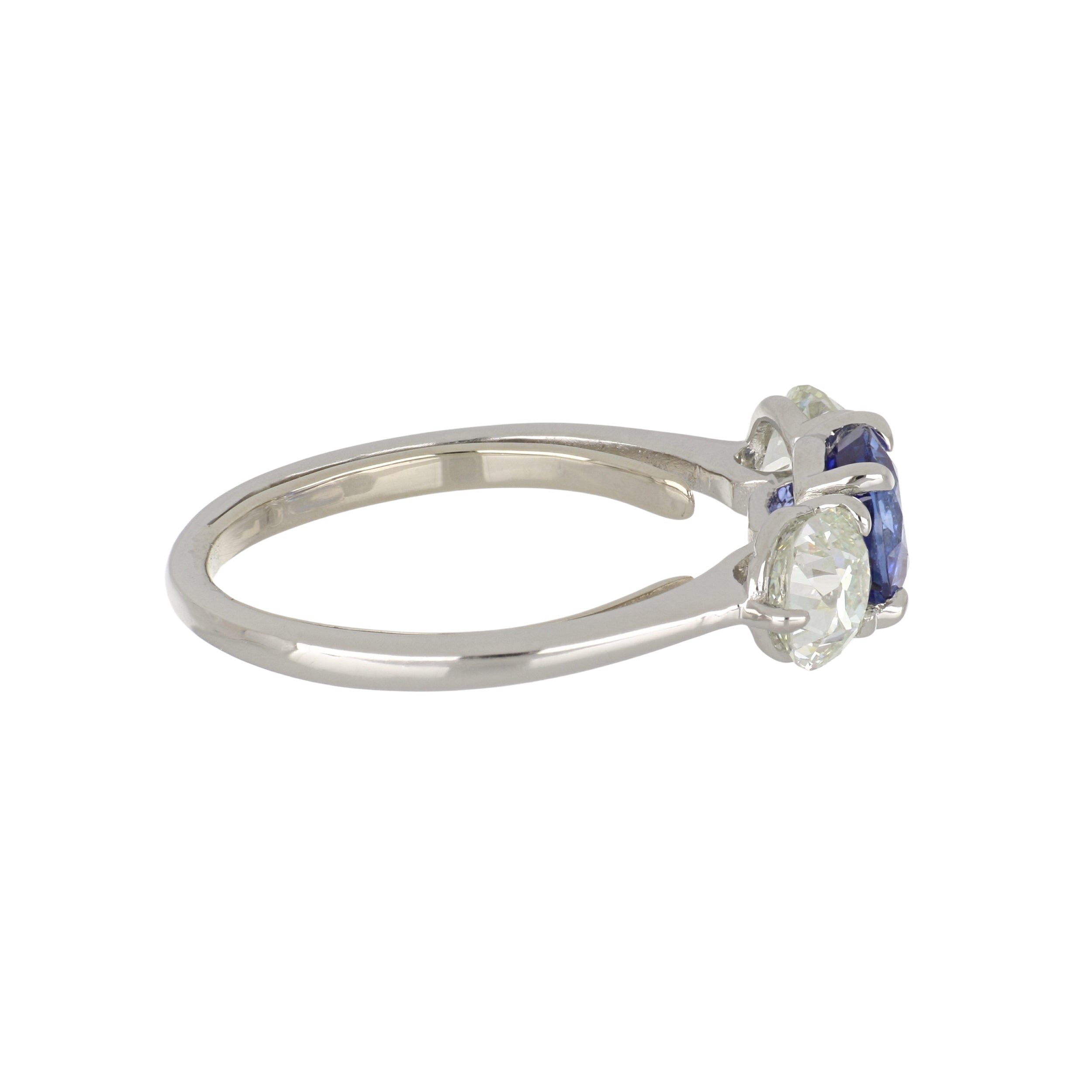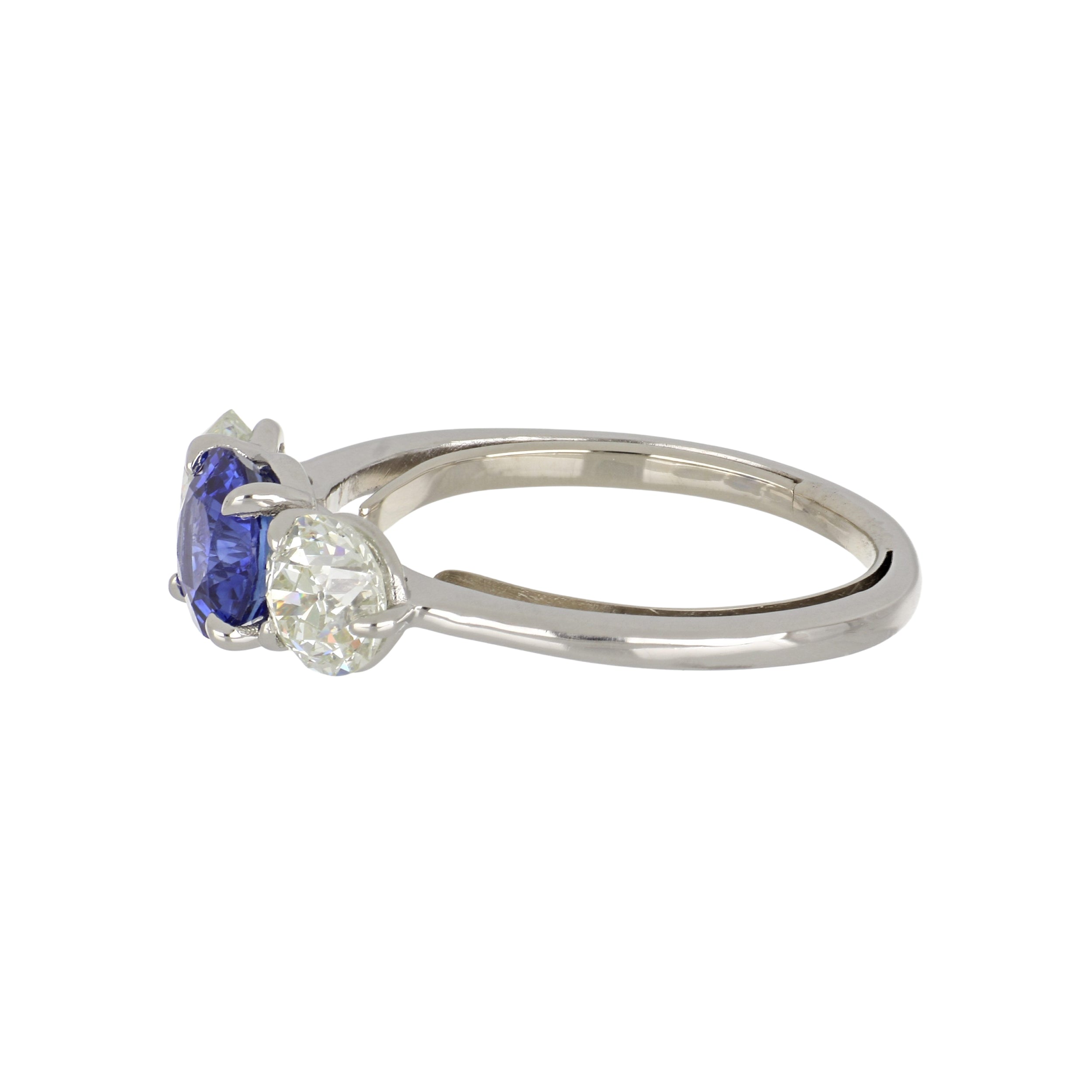 An estate round-cut sapphire and Old Mine-cut diamond three stone engagement ring, set in platinum. Circa 2020.