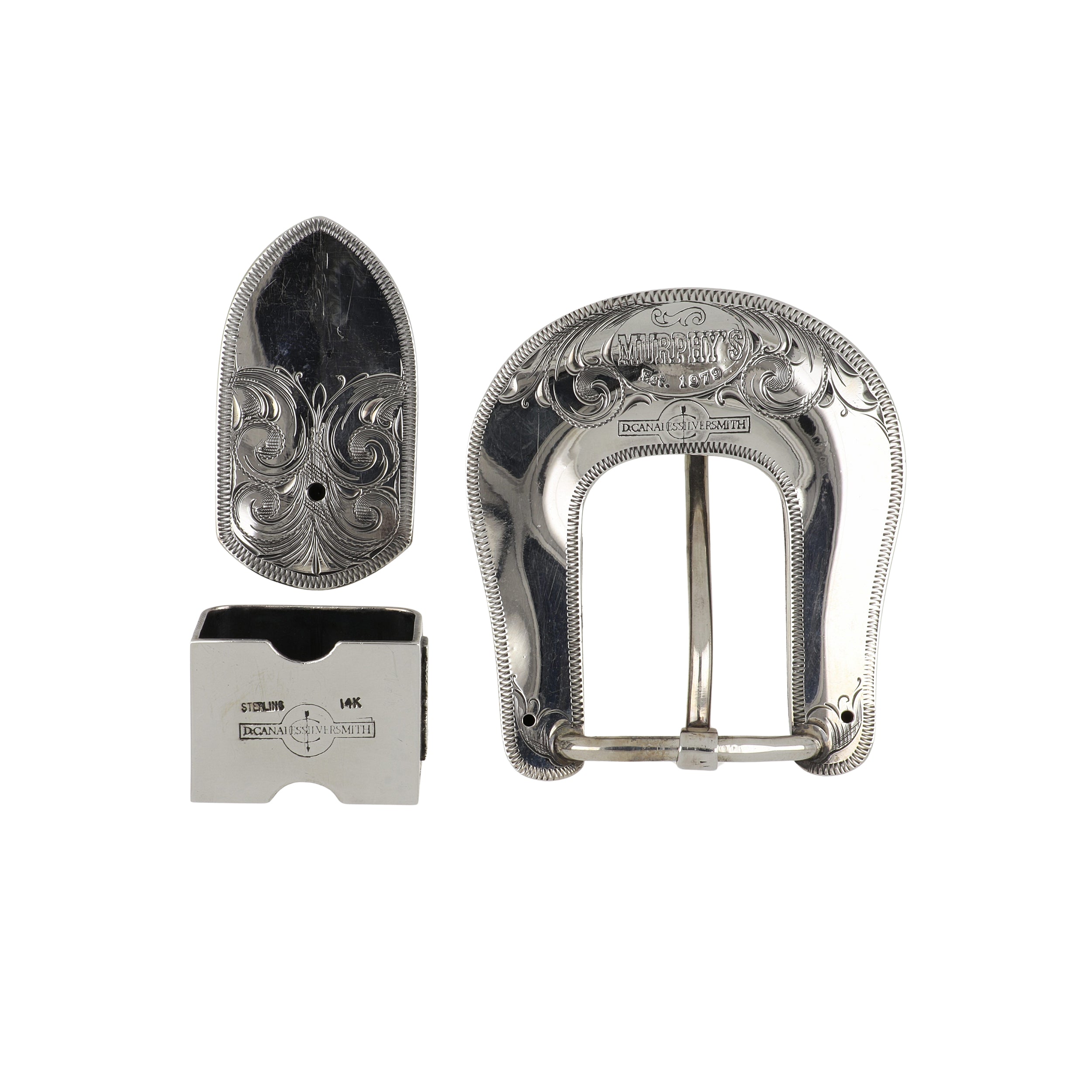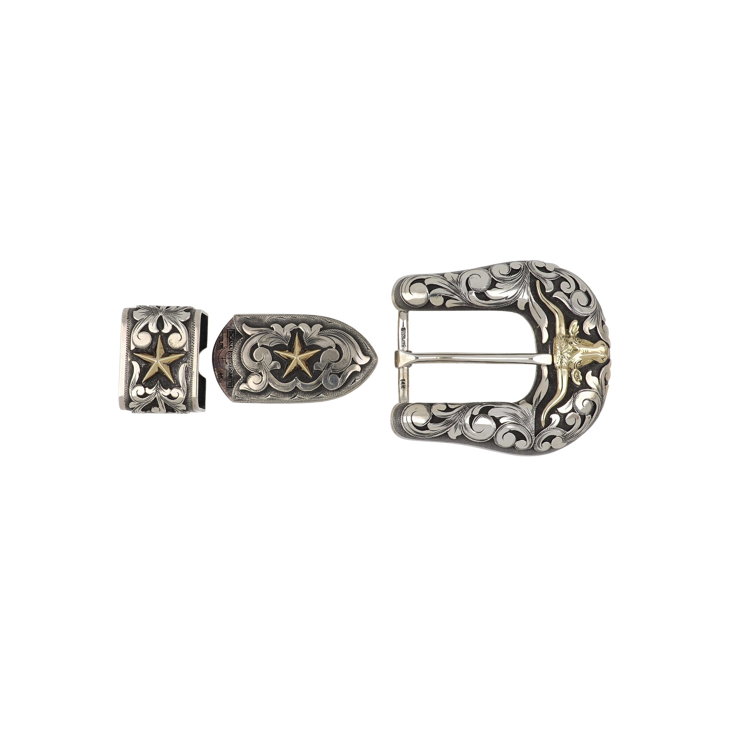 A sterling silver longhorn 3 piece belt buckle with a yellow gold overlay. Handmade in Texas.