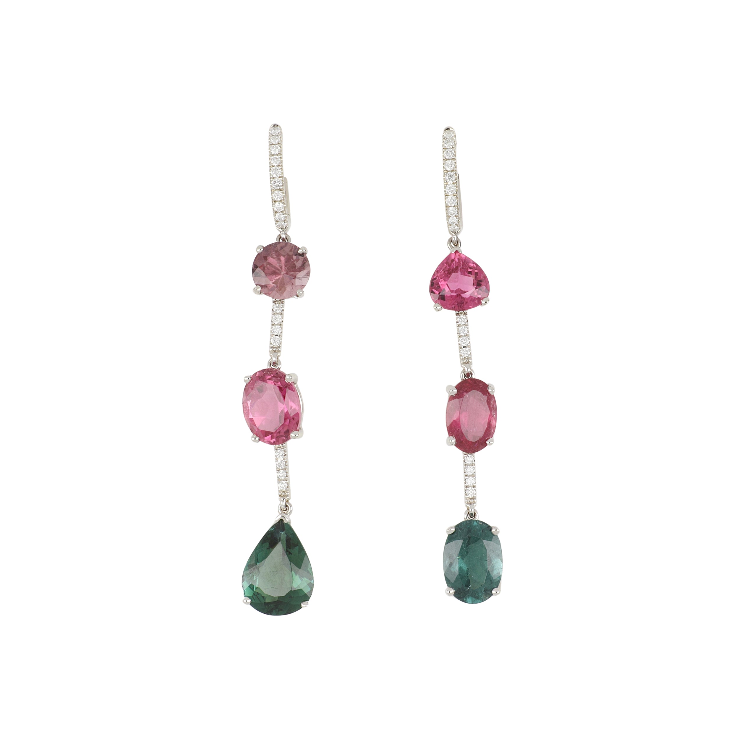A pair of Lisa Nik mixed-shape pink and green tourmaline drop earrings with diamonds, set in 18K white gold.