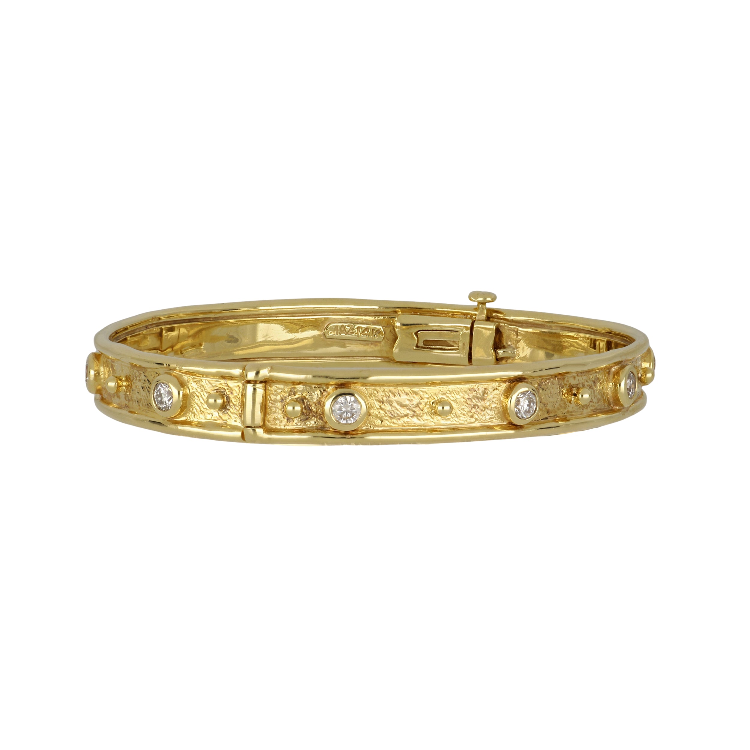A Mazza hammered finish hinged bangle bracelet with bezel-set round brilliant-cut diamonds, set in 14K yellow gold.
