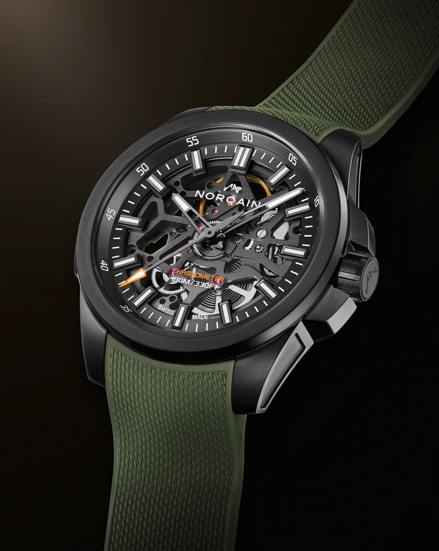 Bracelet: Integrated khaki rubber strap with “Milanese” pattern – stainless steel black DLC pin buckle
