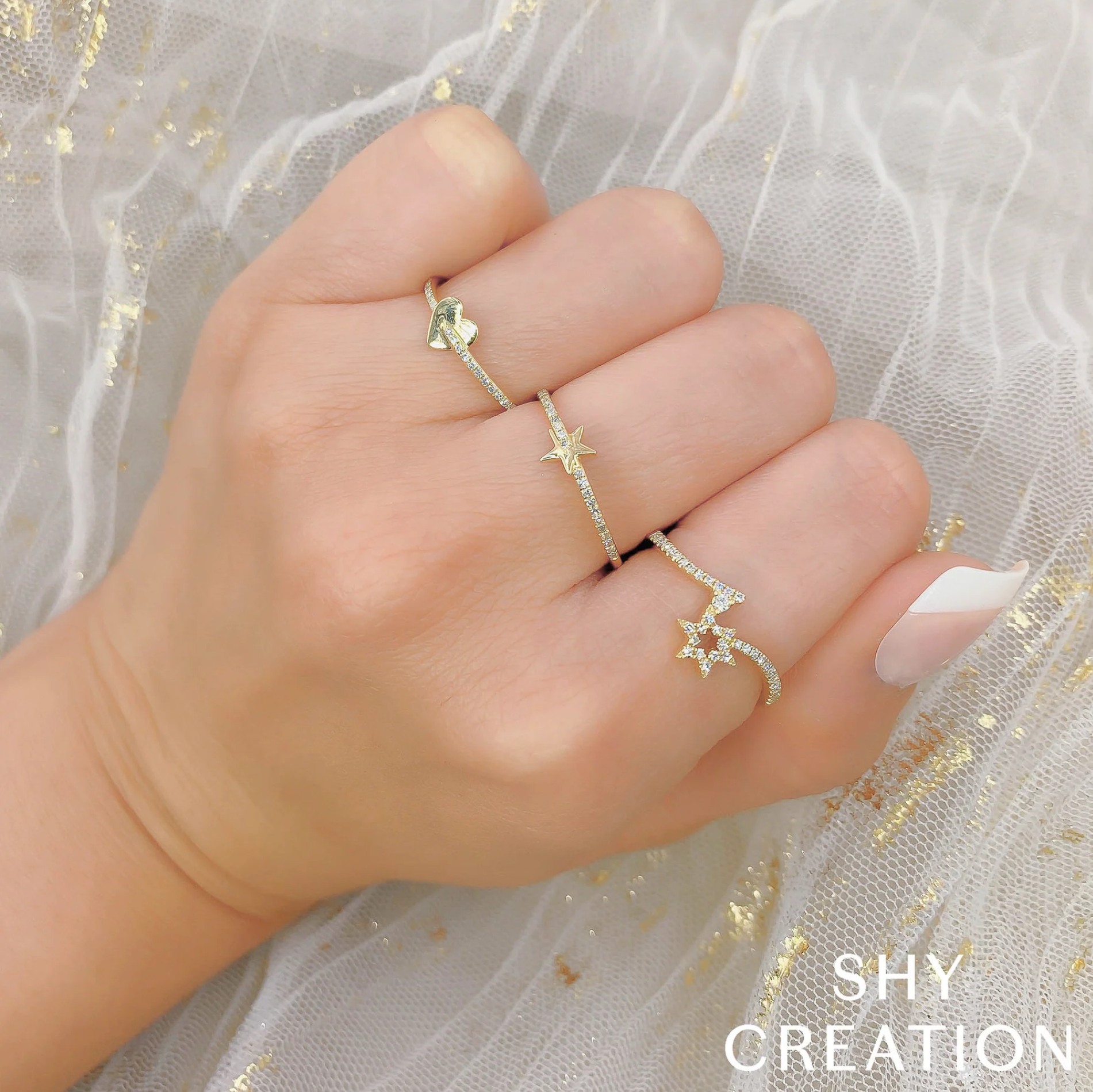 A Shy Creation diamond heart half band, set in 14K yellow gold.