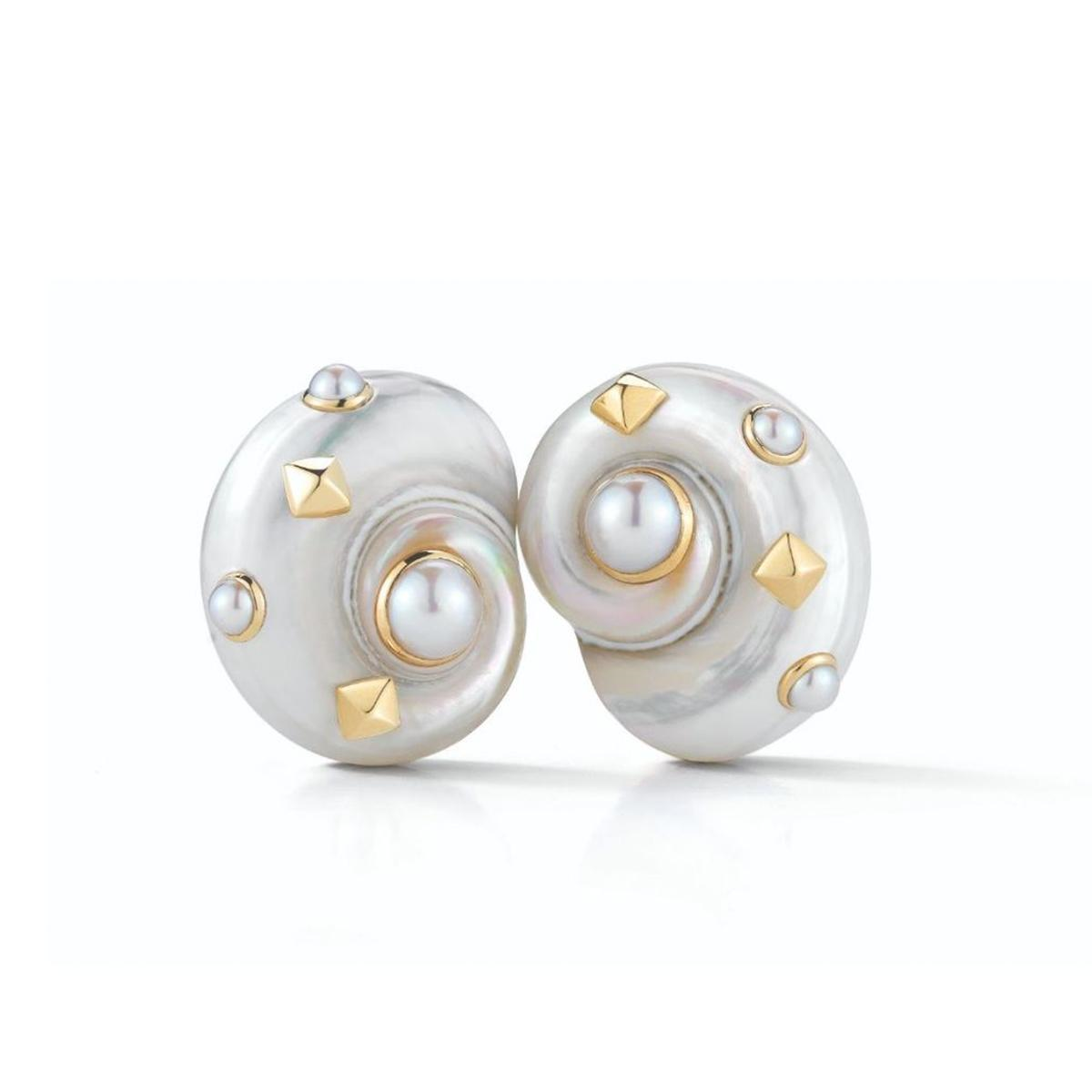 A pair of Trianon Umbonium shell earrings with pearl and gold pyramid stud accents, set in 18K yellow gold.