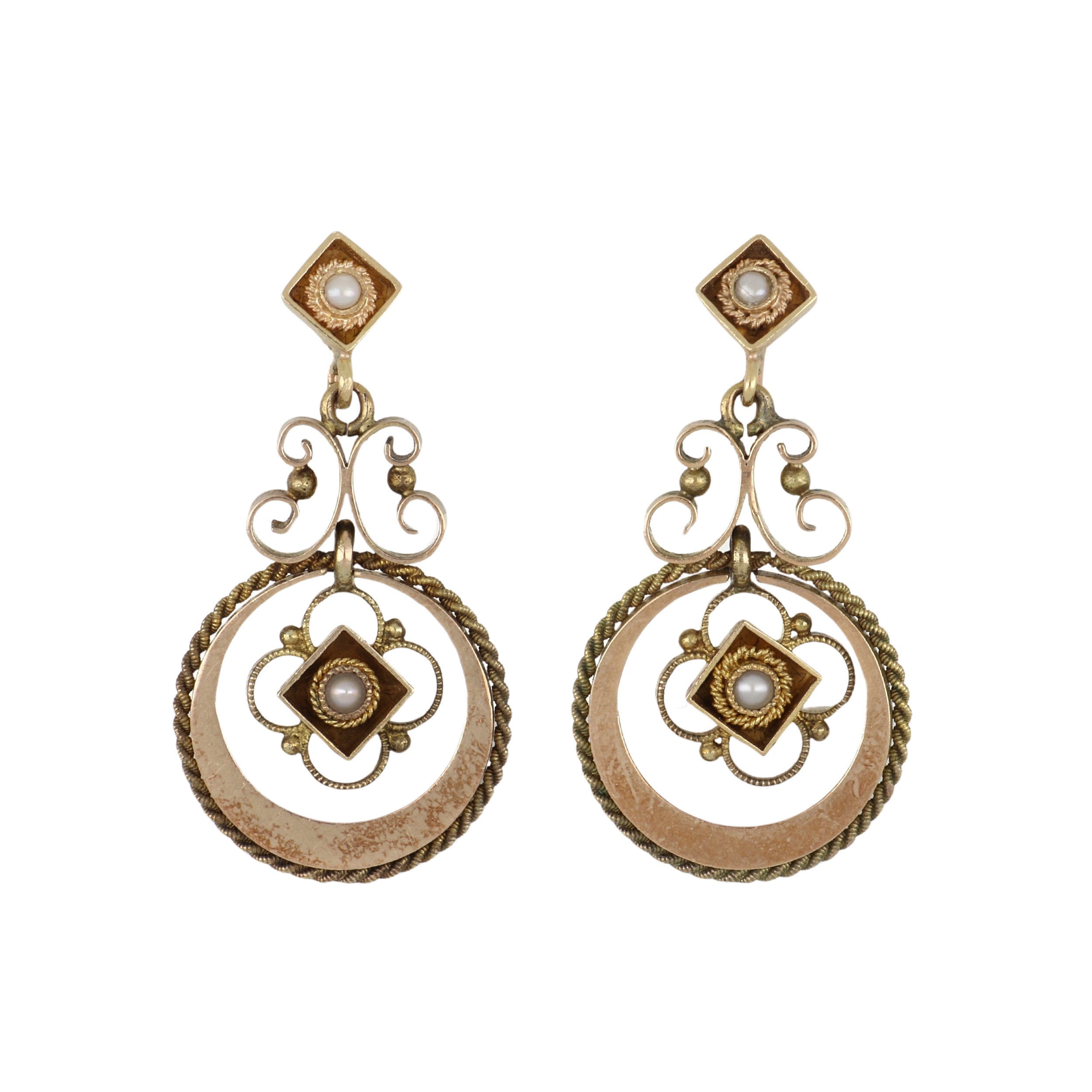 A pair of Victorian drop earrings with split pearls, set in 18K and 14K yellow gold. Circa 1870.