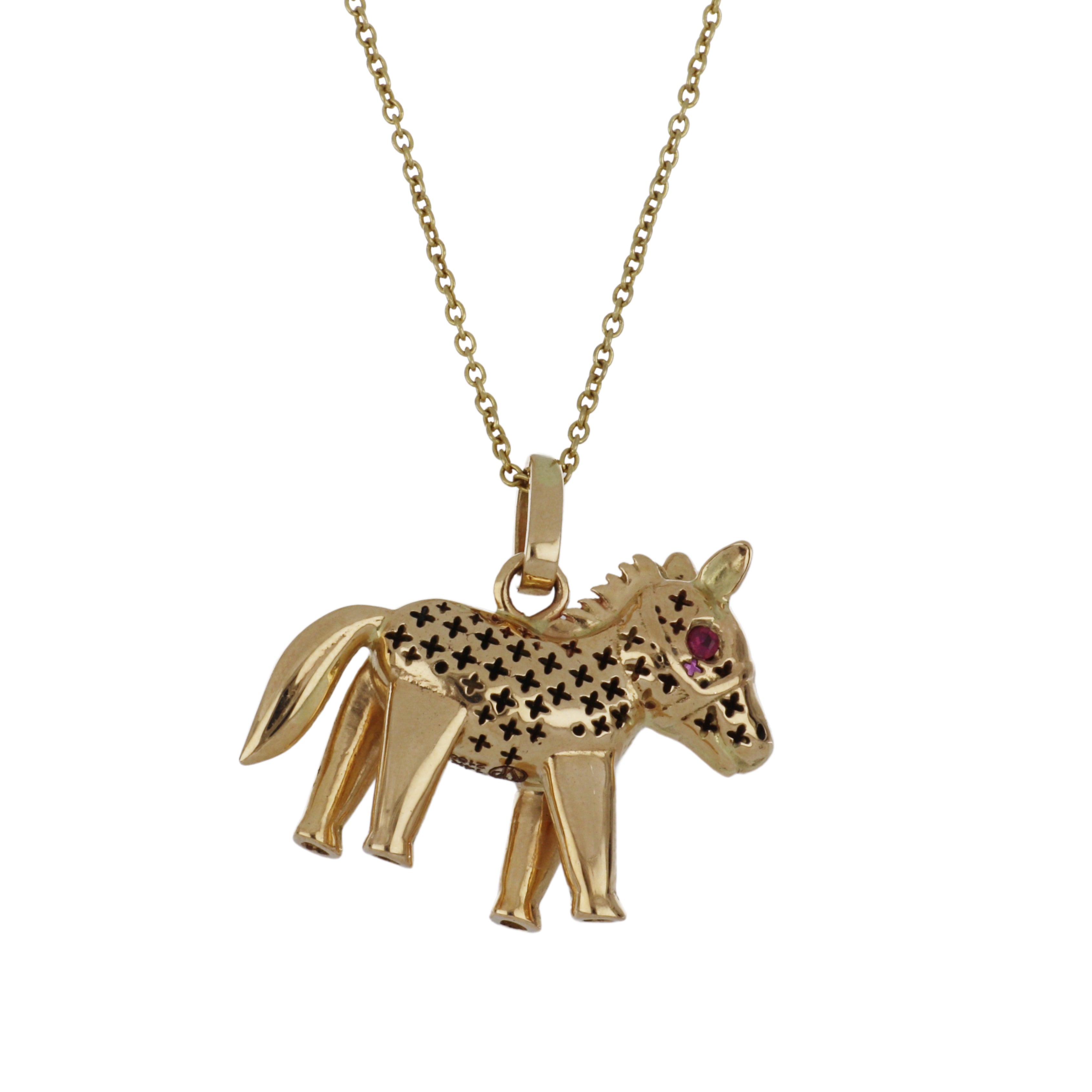 A Vincent Peach small horse pendant necklace with ruby eyes, set in 14K yellow gold.