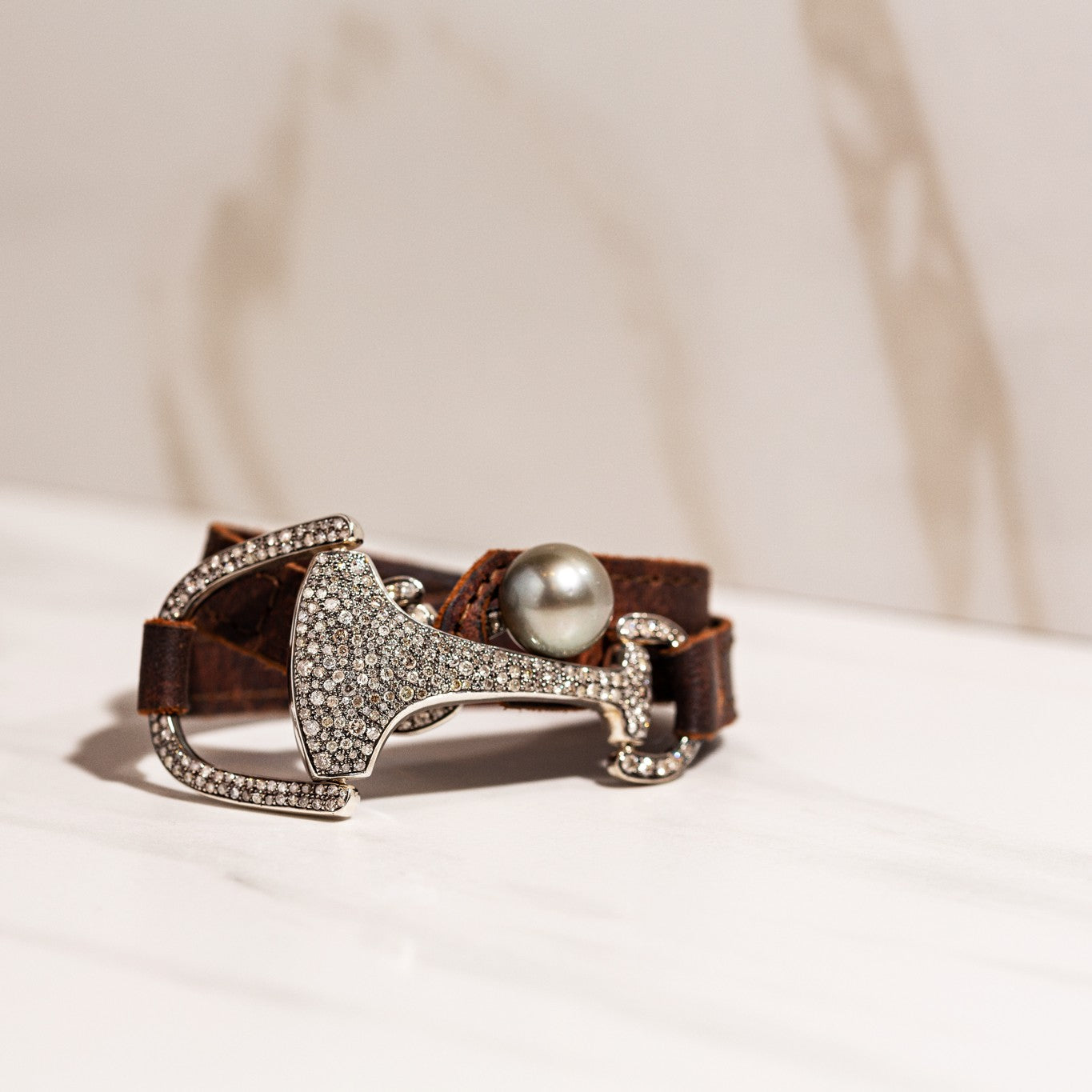 Vincent Peach Sterling Silver Diamond Horse Bit Leather Wrap Bracelet