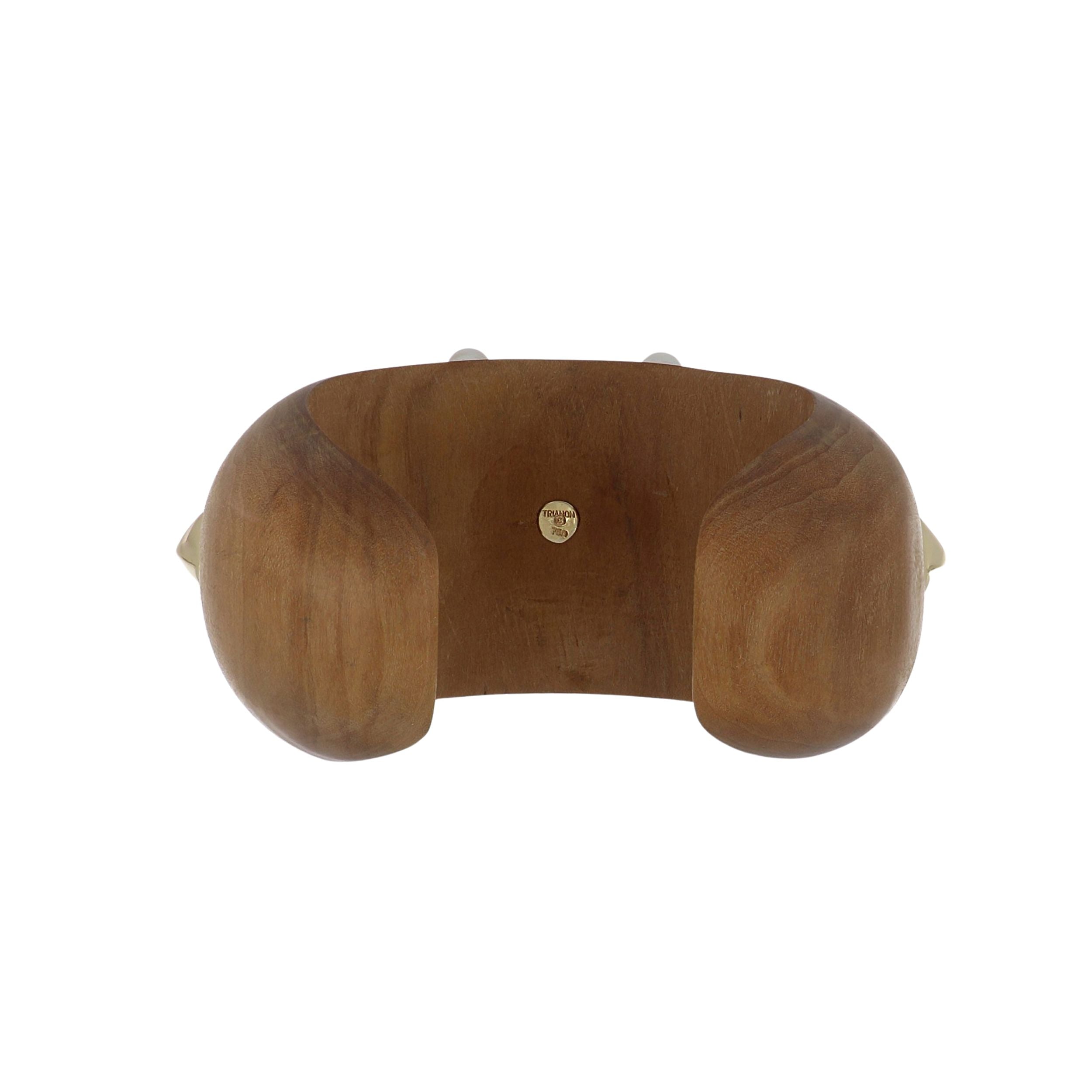 An vintage Trianon wood cuff with pyramid studs and pearls, set in 18K yellow gold. Circa 1980.