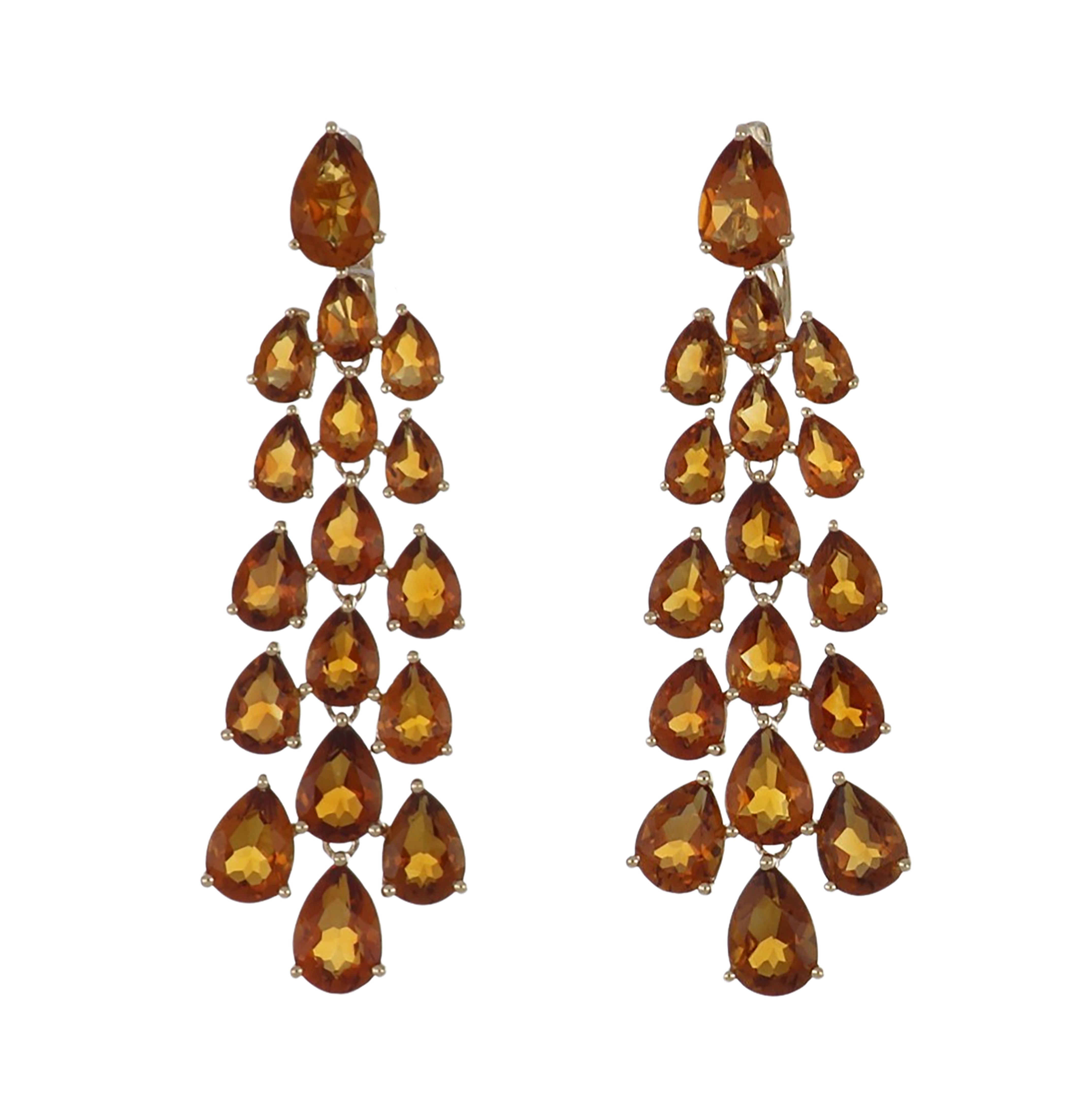 A pair of pear shape citrine chandelier earrings, set in 14K yellow gold.