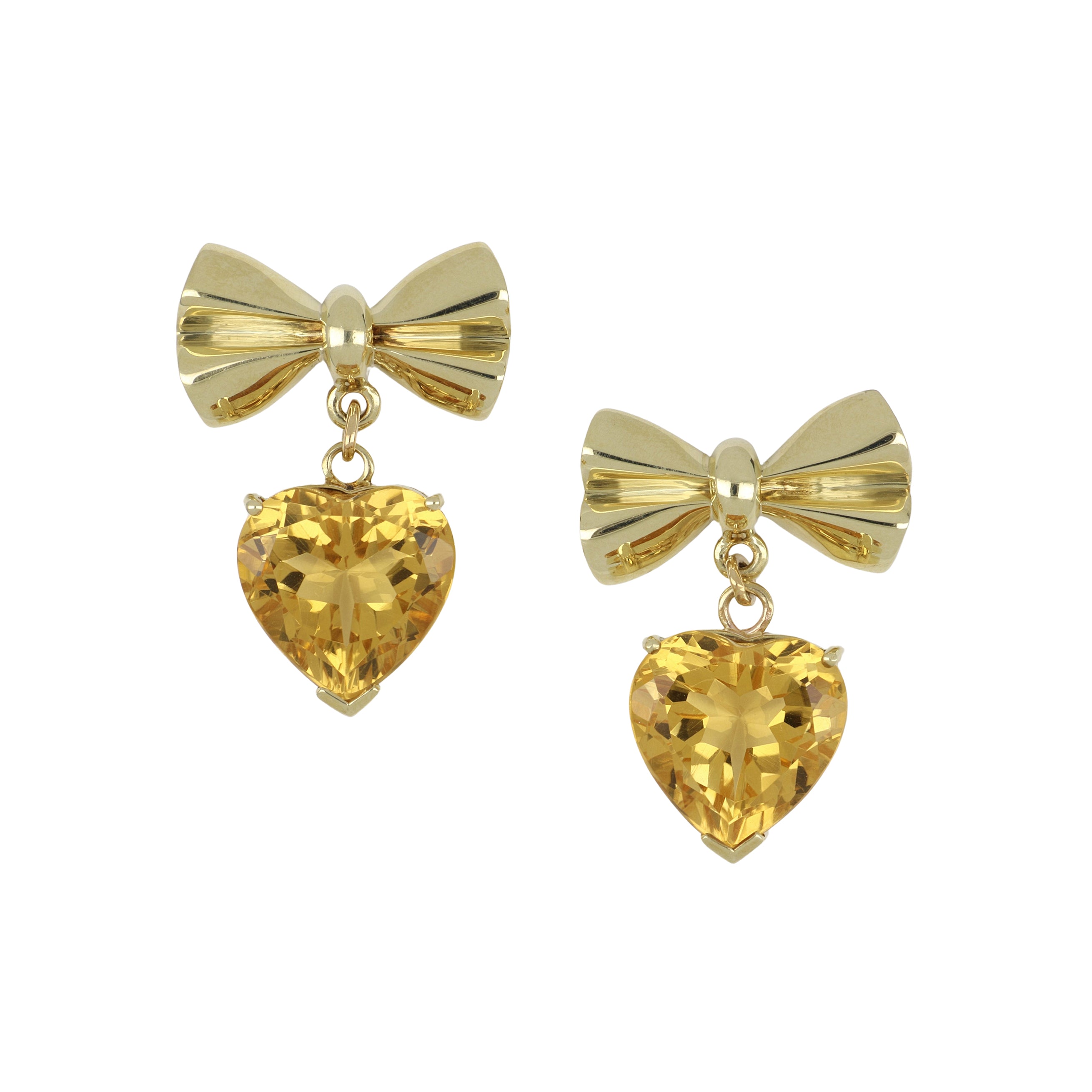 A pair of vintage heart shape citrine drop earrings with bowtie tops, in 14K yellow gold. Germany, circa 1990.