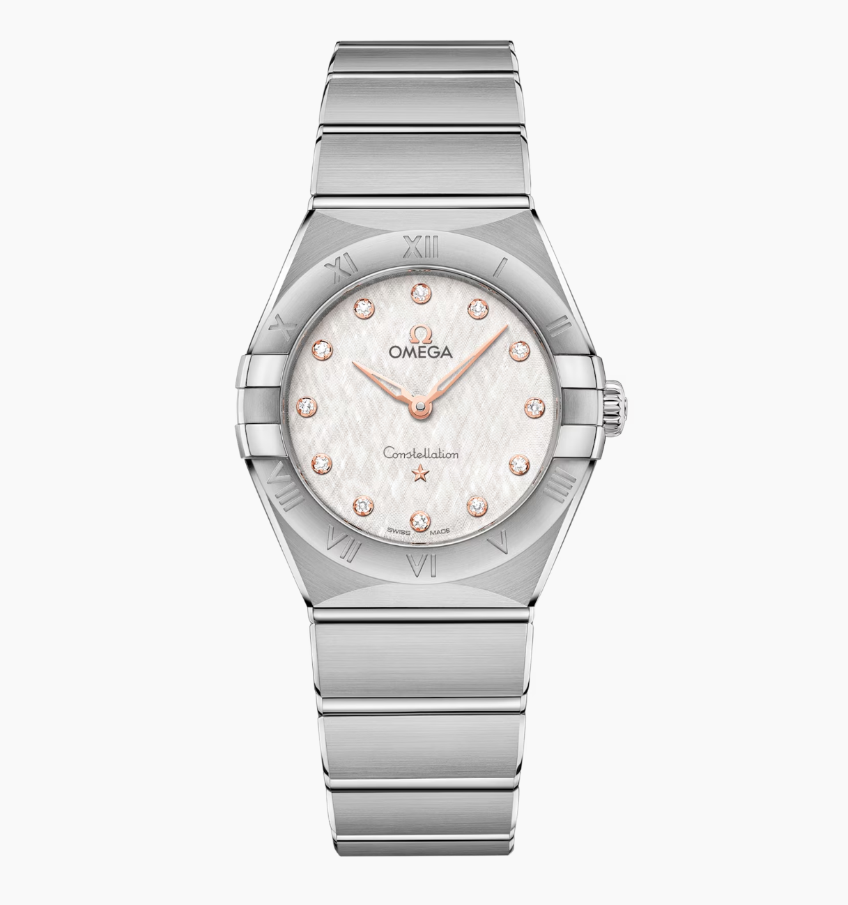 This 28mm stainless steel model features a bezel engraved with Roman numerals, cream silvery dial with silk-like pattern and scratch-resistant sapphire crystal. The hands, OMEGA logo, Constellation star and diamond holders are in 18K Sedna™ gold.