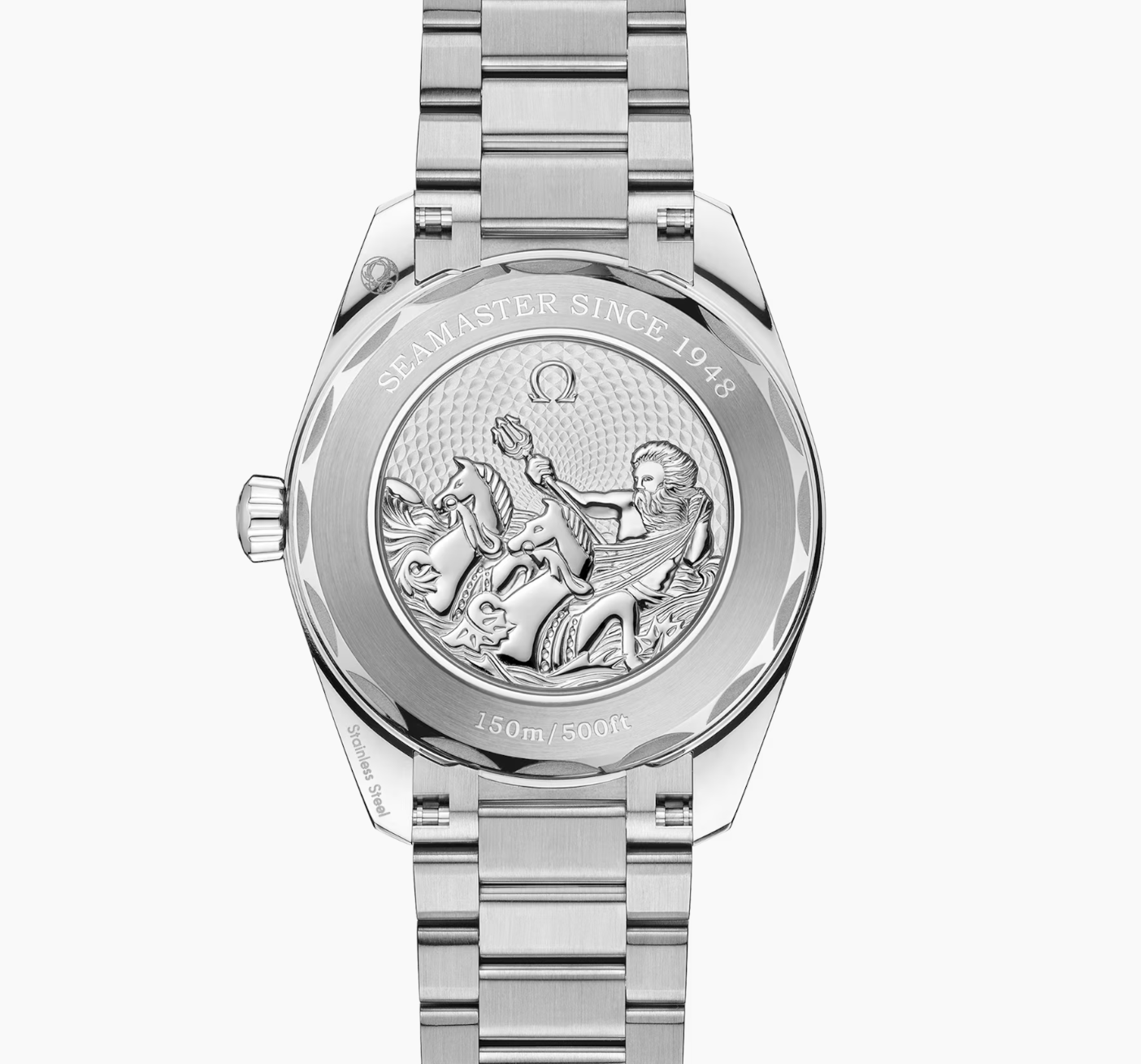 Turning the watch over reveals a stamped commemorative Seamaster logo depicting a trident-bearing Poseidon and two seahorses: OMEGA’s 1956 original and the brand’s current design. Behind which sits OMEGA’s Co-Axial Master Chronometer calibre 8800, certified at the industry’s highest level by the Swiss Federal Institute of Metrology (METAS).