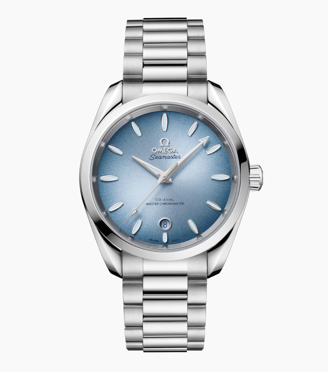 This 38 mm Aqua Terra, with a symmetrical case in fully polished stainless steel, has a polished and brushed bracelet formed by beautifully rounded links.