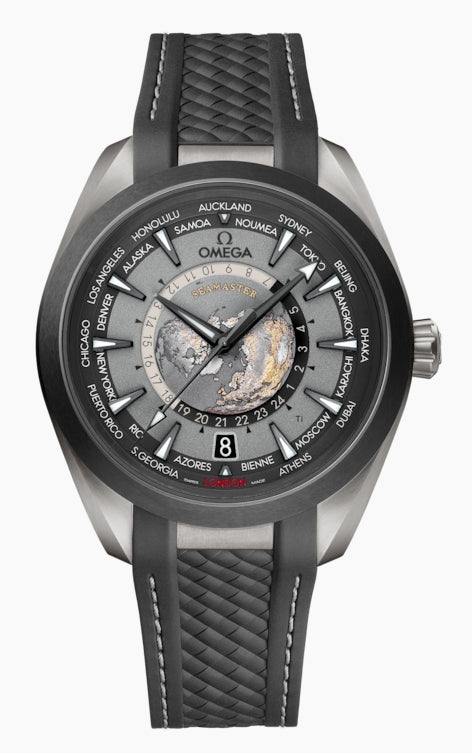 At the centre of the black and grey dial, framed by a brushed black ceramic bezel, OMEGA has produced a vision of Earth, viewed from above the North Pole, by laser-ablating continents and colours on a grade 5 titanium surface. Circling the topographic map is a 24-hour indication, divided into night and day sections.