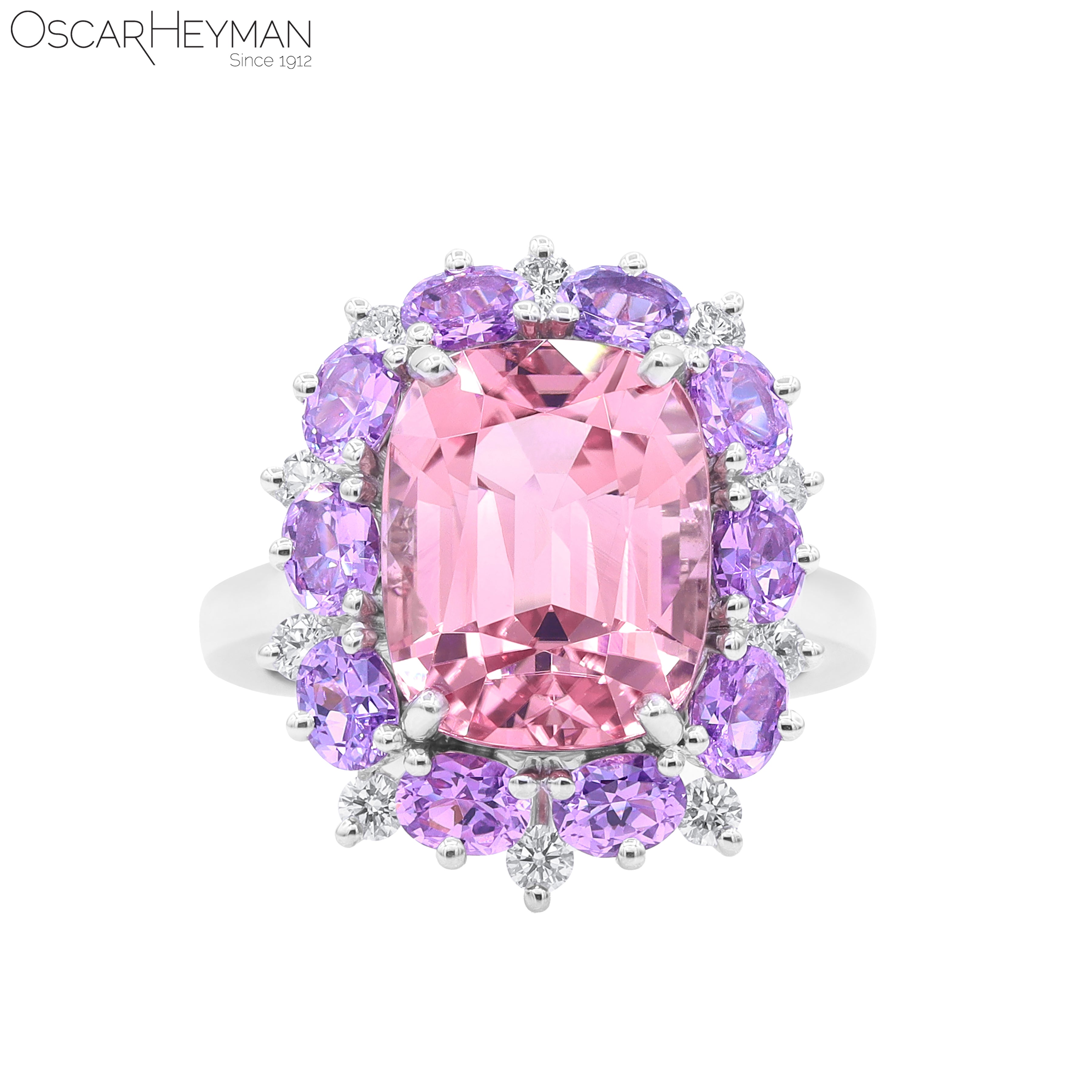 An Oscar Heyman cocktail ring featuring a pink tourmaline, framed by purple sapphires and diamonds, set in platinum. Signed: Oscar Heyman.
