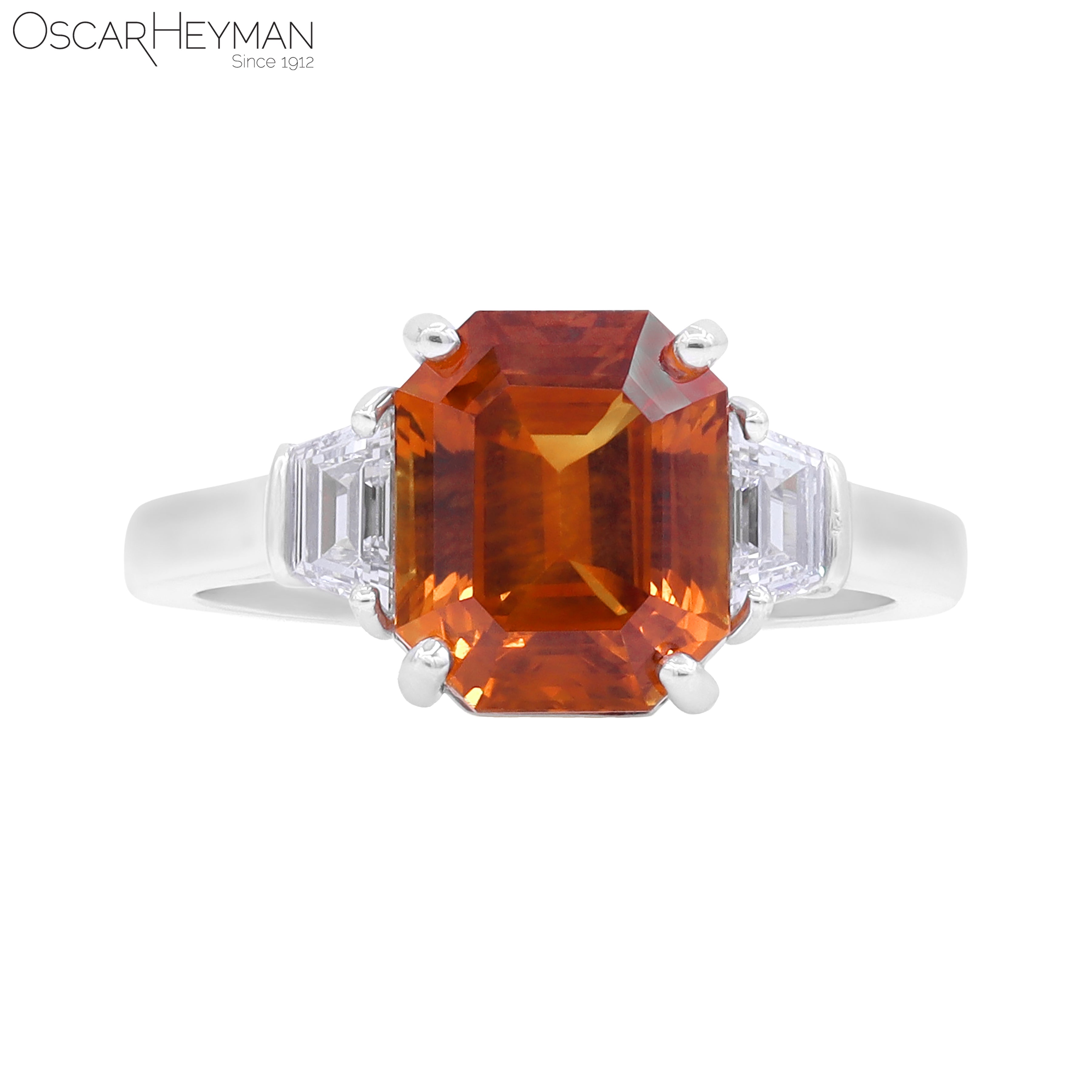 An Oscar Heyman three stone ring featuring a vivid orange Ceylon sapphire and trapezoid cut diamonds in platinum. Signed: Oscar Heyman.