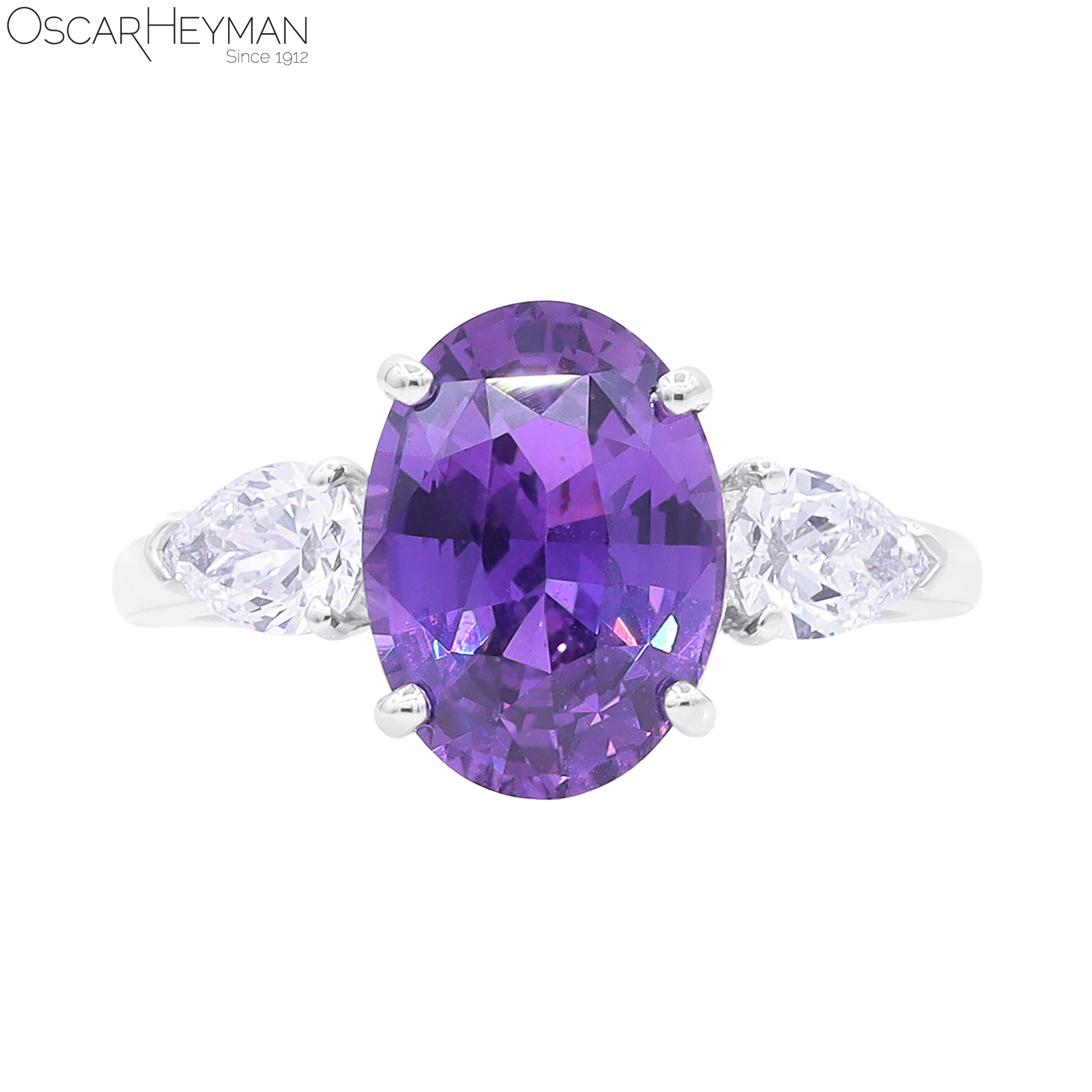 An Oscar Heyman three-stone ring featuring a vivid purple sapphire pear-shaped diamonds, set in platinum. Signed: Oscar Heyman.