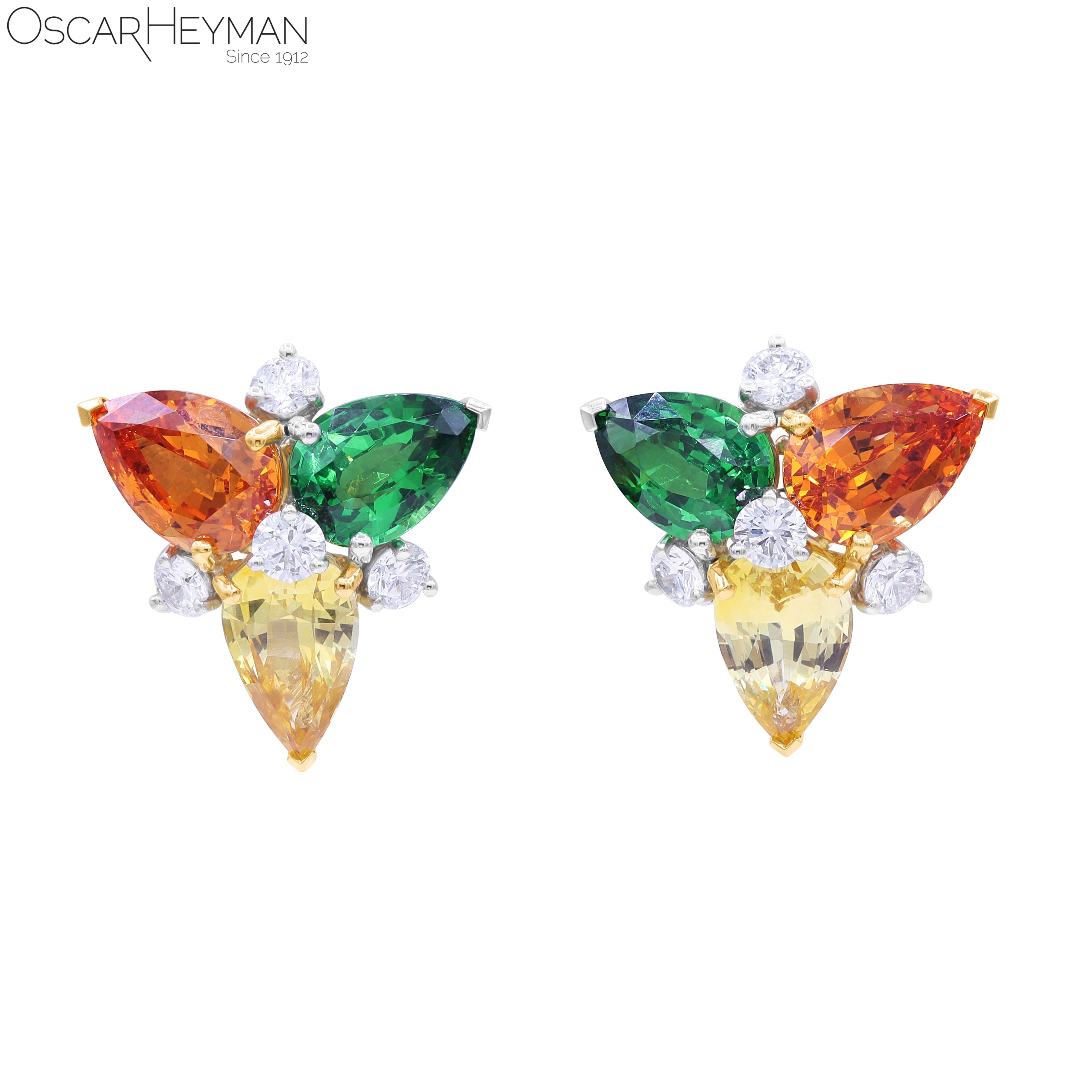A pair of important Oscar Heyman cluster earrings featuring spessartite garnets, tsavorite garnets, yellow sapphires and diamonds set in 18K yellow gold and platinum. Signed: Oscar Heyman.